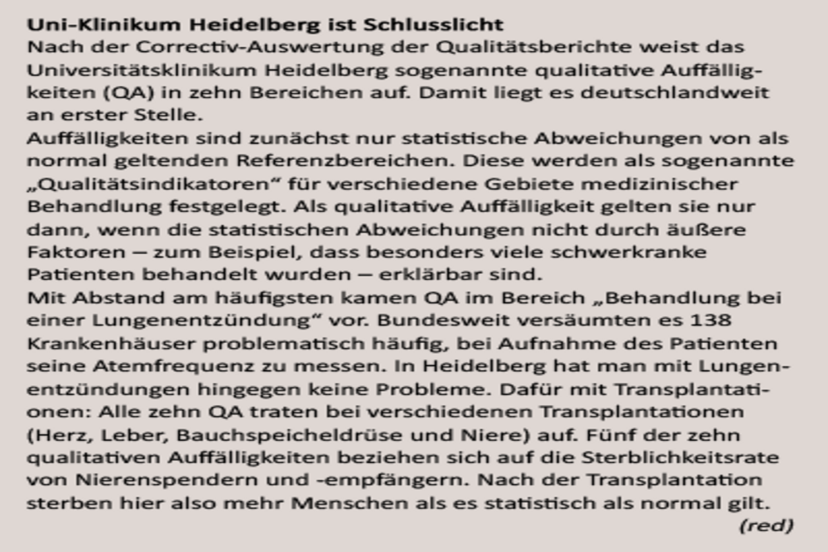 Für ihre Qualitätsberichte betreiben die Krankenhäuser enormen Aufwand. Doch die Berichte nutzen kaum: Sie sind unvollständig, schon bei der Veröffentlichung veraltet und für Laien kaum verständlich. Ganz oben im Mangelranking steht das Uniklinikum Heidelberg.