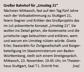 Beim Faktencheck im November 2010 schmelzen die Leistungswerte weiter, die Bahn hat Schwierigkeiten, überhaupt einen funktionierenden Fahrplan für S 21 vorzustellen. Davon unbeirrt gibt die damalige CDU-Verkehrsministerin Tanja Gönner zu Protokoll: "Mit S 21 werden pro Tag 37 Prozent mehr Züge fahren als heute." Die Bahn selbst verkürzt nach unten und will sich einer um 30 Prozent höheren Spitzenkapazität verpflichtet sehen. Die 49 Züge pro Stunde Spitzenkapazität, die die Bahn im Juli 2011 beim Stresstest für S 21 ermittelt, taugen indes nicht nur wegen zahlreicher Verfahrensmängel (Kontext berichtete mehrmals, u.a. <link http: www.kontextwochenzeitung.de politik elf-zu-null-fuer-den-kopfbahnhof-3987.html internal-link-new-window>hier, <link http: www.kontextwochenzeitung.de politik s-21-durchgefallen-schoengerechnet-3848.html internal-link-new-window>hier und <link http: www.kontextwochenzeitung.de politik was-vom-spruche-uebrig-blieb-3216.html internal-link-new-window>hier) kaum als Beleg für die Überlegenheit der Tunnelstation. Denn einen vergleichenden Stresstest für den Kopfbahnhof, unter anderem vom baden-württembergischen Verkehrsminister Winfried Hermann gefordert, lehnt die Bahn ab.