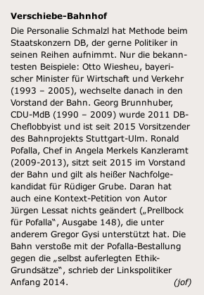 Vielleicht sprachen gerade fachliche Gründe für Schmalzl als Bahn-Aufseher. Denn zumindest in einem Feld, das dem einstigen Konzernchef Grube und seinem Vorstand seit Jahren Sorgen macht, kennt sich der Ministeriumsnovize gut aus. Als schwäbischer Regierungspräsident verantwortete Schmalzl zahlreiche Genehmigungsverfahren zu Stuttgart 21. Diese vollzog seine Behörde im Auftrag des Eisenbahnbundesamts.