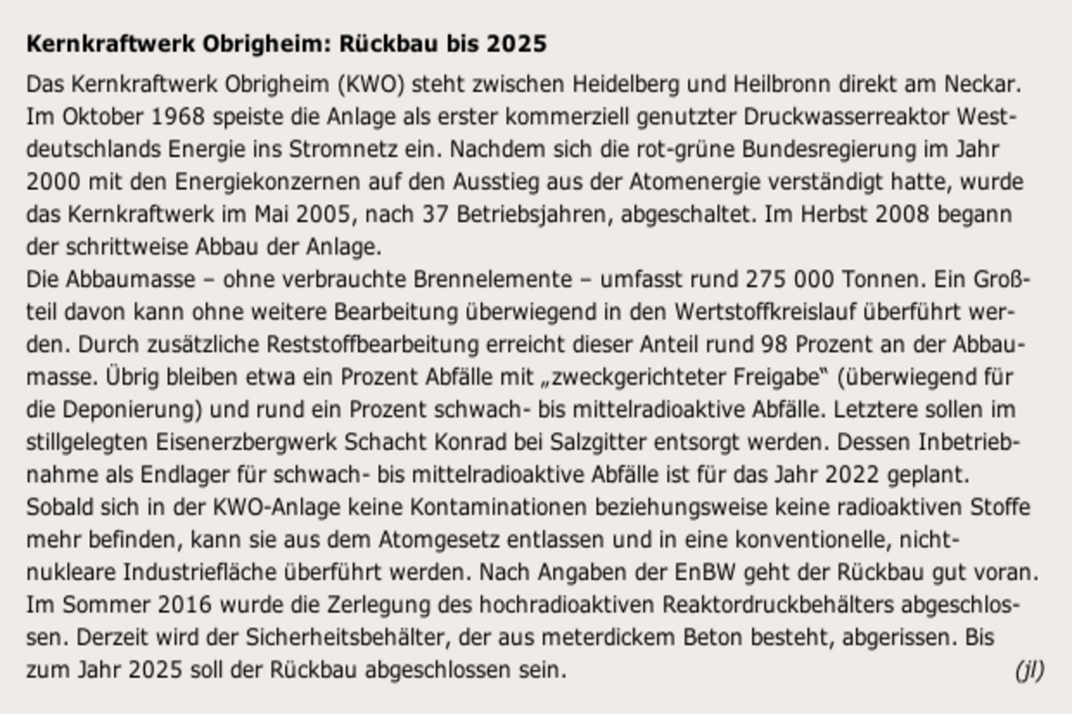 Bereits vor vier Jahren deutete der Konzern öffentlich an, die abgebrannten Brennelemente seines ältesten Atommeilers nach Neckarwestheim verlagern zu wollen. "Der Bau eines weiteren Zwischenlagers wird damit überflüssig", nannte Jörg Michels, Chef der EnBW-Kernkraft GmbH, damals als entscheidenden Vorteil der Verlagerungspläne. Der Abtransport der Brennelemente unterstütze zudem "maßgeblich den weiteren verzögerungsfreien Rückbau des Kernkraftwerks Obrigheim". Sprich: Sind die Brennelemente erstmal weg, könne das Reaktorareal schneller zur "grünen Wiese" werden.