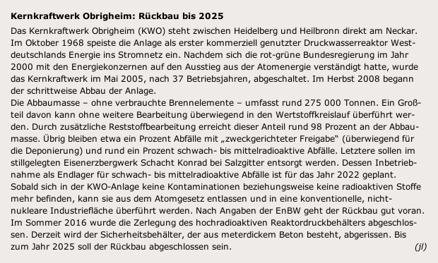 "Die EnBW hat sich jahrzehntelang vor dem Bau eines halbwegs sicheren Zwischenlagers gedrückt", moniert Würth außerdem. Stattdessen lagere der Konzern seit Abschaltung des Obrigheim-Meilers die abgebrannten Brennstäbe in einem völlig unzureichenden Nasslager außerhalb des besonders geschützten Sicherheitsbehälters, nämlich in einer simplen Industriehalle. Bei allen anderen deutschen Kernkraftwerken wurden die Betreiber dazu verpflichtet, ein stationäres Zwischenlager zu errichten. "Ein derartiges Handling der Brennstäbe wie in Obrigheim ist unter Sicherheitsaspekten ein Skandal", sagt Würth. Franz Wagner vom Aktionsbündnis Energiewende Heilbronn ergänzt: "Das atomare Erbe gehört zu den schlimmsten Erblasten unserer Generation. Die EnBW trägt große Schuld daran, und jetzt versucht sie sich mit den Transporten an einer Scheinlösung."