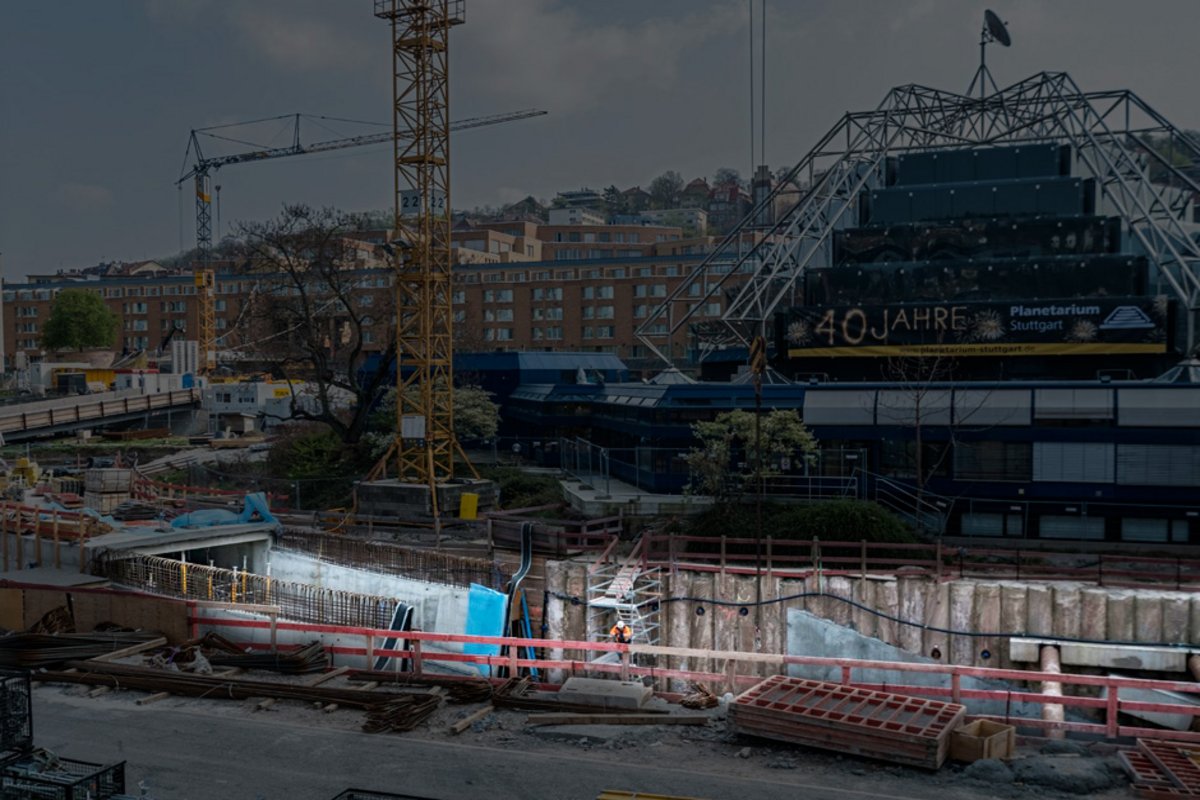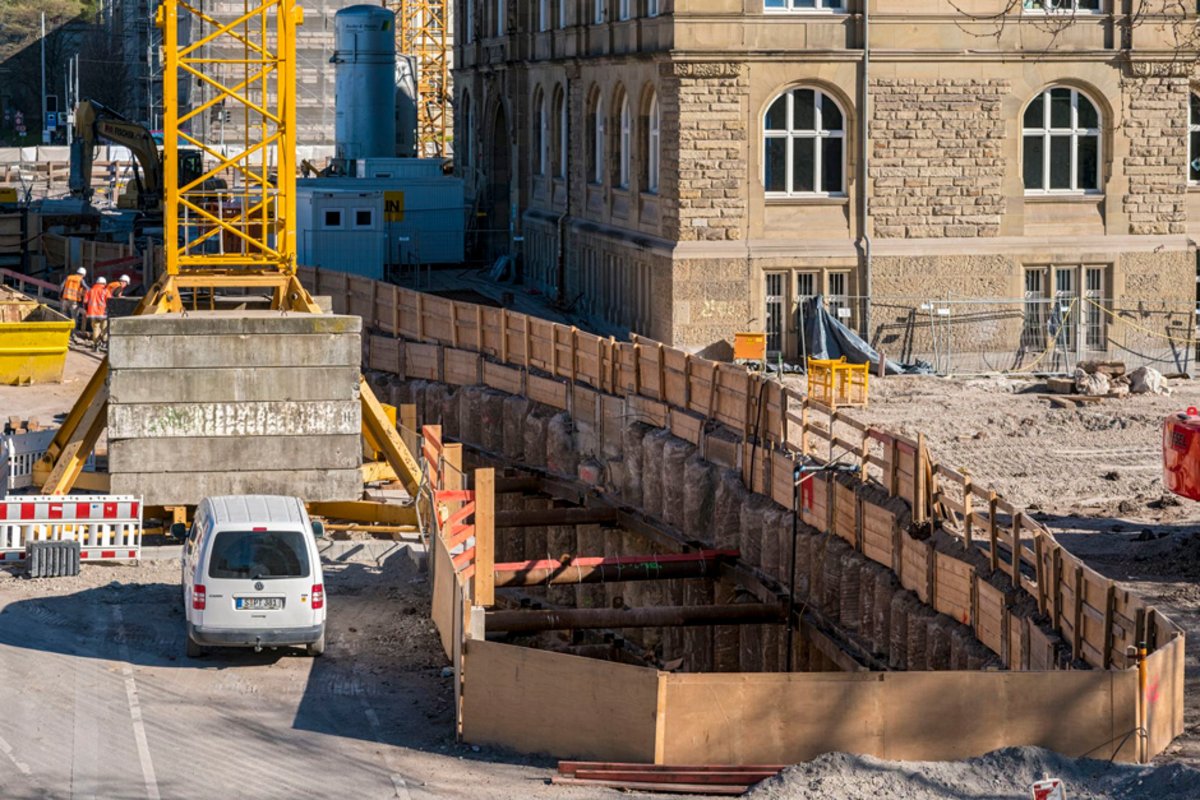 2013 übernahm Züblin, wollte aber die Baumethode ändern. Statt im bergmännischen Verfahren unterirdisch mit Druckluft, beabsichtigte das Unternehmen nun, in offener Bauweise vorzugehen. Dazu bedurfte es einer Planänderung, der 14ten allein im Planfeststellungsabschnitt 1.1, der die Talquerung und damit den Düker betrifft. Im November 2014 trudelte die Genehmigung ein, mit Auflagen zum Schutz des Mineralwassers. Im Juni 2015 verkündete die Bahn den Baubeginn. Die offene Grube zum Bau des Dükers ist eben dieser tiefe Kanal, so tief, dass man von außerhalb des Baugeländes nicht auf den Grund sehen kann.