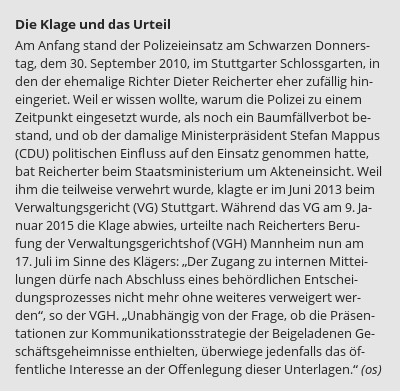Unser Autor wollte vom Staatsministerium Einsicht in Akten zum Polizeieinsatz am 30. September 2010. Die wurde ihm teilweise verweigert. Zu Unrecht, wie nun der Verwaltungsgerichtshof Mannheim geurteilt hat. Einblicke in die Politik des Gehörtwerdens aus der Sicht eines Betroffenen.