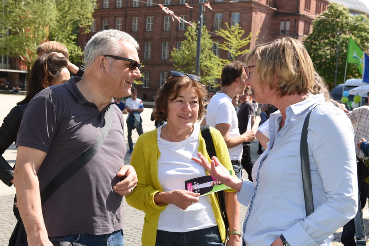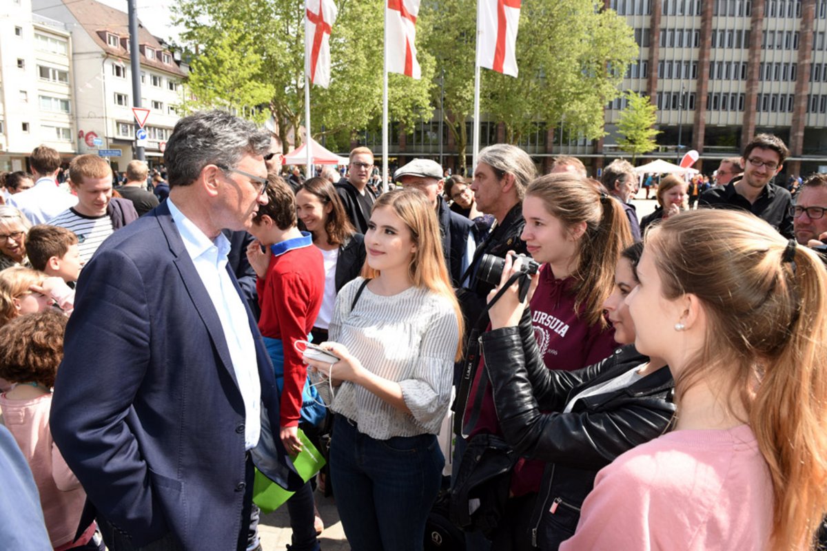Altstadträte sind gekommen zum Picknick der Grünen Jugend. Schülerinnen aus dem nahen St. Ursula-Gymnasium, die Salomon nach der Bedeutung von Europa fragen. FC-Freiburg-Fans auf Stippvisite vom Gang ins Stadion. Ein paar dutzend ZuhörerInnen, die zu dem gehören, was inzwischen als Establishment gilt in der Stadt mit dem Markenzeichen "Green City". Einige reden auf den OB ein. "Sie hätten mal früher rauskommen müssen aus Ihrem Rathaus", hält ihm ein junger Mann entgegen. Andere wollen sich von dem Verdruss nicht anstecken lassen, der nach 16 Jahren Amtszeit entstanden ist. Nein, sagt eine Frau, "was hier abläuft", könne sie nicht erklären. Selbst wenn der OB Fehler gemacht hat, sei das noch lange kein Grund, ihn abzuwählen: "Schauen Sie sich um, wo ist es schöner?"