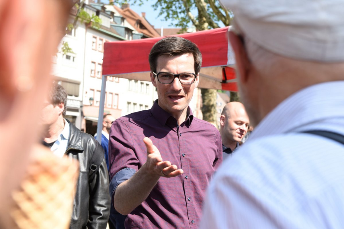 Der Blick über den Platz an der Alten Synagoge bleibt hängen am mobilen Wohnzimmer, mit dem der Herausforderer auf Wahlkampftour ist. Er wird von vielen Gruppen unterstützt, von der Kulturliste und vom Kita-Gesamtelternbeirat, von der FDP-Gemeinderatsfraktion und vor allem der SPD. Martin Horn, Schwiegersohn-Typ mit der hippen Siebziger-Jahr-Brille, belegte überraschend Platz eins im ersten Wahlgang (34,7 Prozent). Das hat er auch dem Kümmerer-Image zu verdanken, das er sich auf ungezählten Terminen in den vergangenen Wochen hart erarbeitet hat. Denen, die ihm an diesem frühen Samstagnachmittag eine Woche vor der Stichwahl an den Lippen hängen, reichen vage Versprechungen, die jungenhafte Ausstrahlung des erst 33-Jährigen und ein paar kommunalpolitische Versatzstücke. Als er das Wort Leerstandskataster in die Runde wirft, versucht ihm ein älterer Zuhörer Näheres zu entlocken. Der Kandidat bleibt flockig und wechselt mit dem Satz "Als OB kann ich keine tausend Wohnungen aus der Tasche ziehen" das Thema.