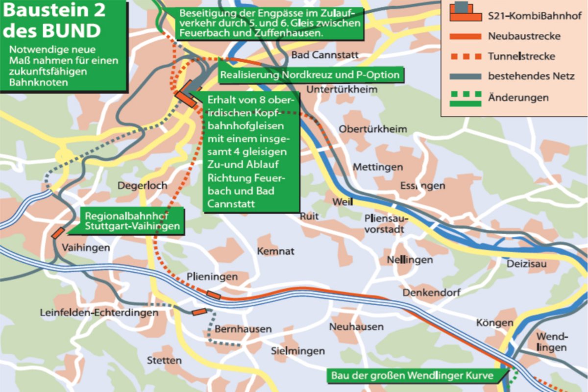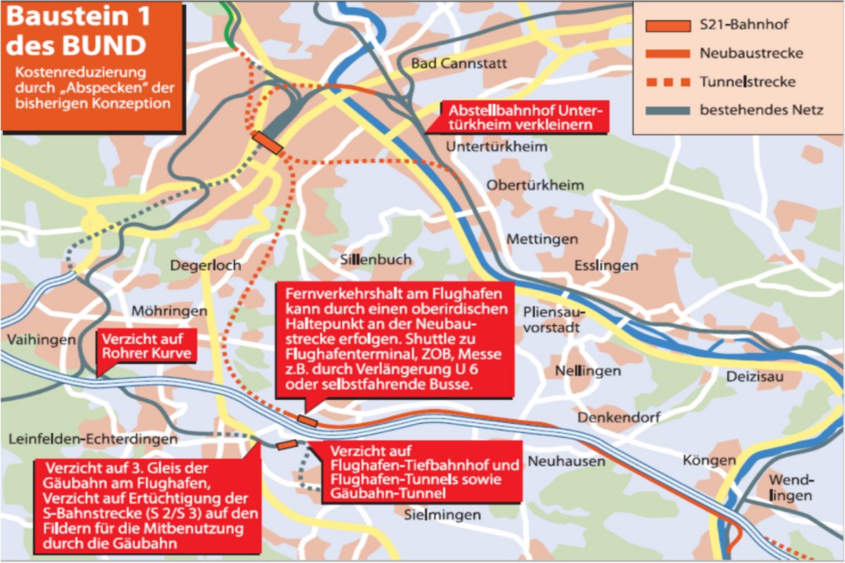 Hilfestellung könnte nun vom BUND Baden-Württemberg kommen, denn der Umweltverband legt mit <link https: www.bund-bawue.de themen mensch-umwelt stuttgart-21 stuttgart-21-kombimodell external-link-new-window>"Stuttgart-21-KombiModell" ein Konzept mit, so die Ankündigung, "wesentlichen Verbesserungen" vor. Inzwischen, schreibt der BUND in seinem Vorstoß, seien "Stand Mitte 2018 mit fast 70 Prozent mehr als zwei Drittel der insgesamt 57 Kilometer Tunnelstrecken gebohrt". Und weiter, der Seitenhieb muss sein: "Wir sehen uns in unseren schon vor über zehn Jahren gemachten Prognosen, gutachterlich belegten Aussagen und Fakten hinsichtlich Kostenexplosionen, Zeitverzögerungen und technischer Probleme bestätigt – das Prestigeprojekt war von Anfang an schöngeredet und -gerechnet." Dennoch sind die S-21-GegnerInnen des BUND zu einem Pragmatismus in der Lage, den BefürworterInnen noch nie an den Tag legen wollten: Sie bauen in die neuen Überlegungen ein, dass es einen Tiefbahnhof geben wird, und bewerten einen Baustopp zum jetzigen Zeitpunkt als "unrealistisch".