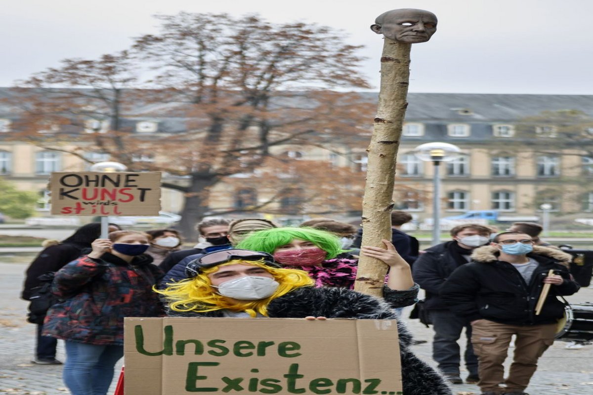 860 Studierende hat aktuell die Stuttgarter Hochschule für Musik und Darstellende Kunst. Davon stammen 40 Prozent aus anderen Ländern, innerhalb und außerhalb der EU. Nirgendwo ist der Anteil so hoch wie bei den Musikhochschulen, kaum irgendwo gibt es einen so regen internationalen Austausch – denn natürlich sind deutsche MusikerInnen ebenso in anderen Ländern unterwegs. Die 180 bis 200 Teilnehmer der Demonstration studieren überwiegend an der Stuttgarter Musikhochschule, wie auch am Begleitprogramm erkennbar wird: eine Sängerin mit Gitarrenbegleitung und eine Sambaschule aus der Schlagzeugklasse.