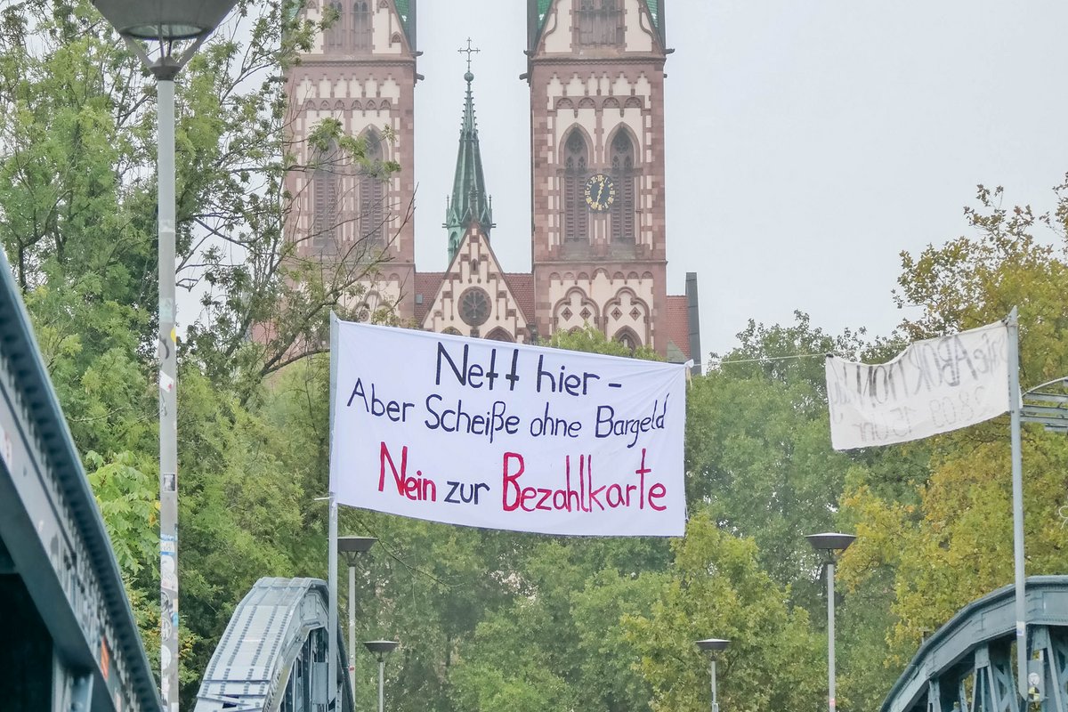 "Ich würde supergerne Fußballschuhe im Internet kaufen", äußert ein Bewohner der Landeserstaufnahmestelle (LEA) auf einer Kundgebung am Freiburger Rathausplatz am 25. September – ein Wunsch, den viele junge Menschen teilen dürften. Wenn die Internetadresse eines Angebots allerdings nicht auf einer behördlichen Whitelist steht, ist die Zahlung nicht möglich. Probleme macht die Karte auch in alltäglichen Situationen. Der junge Mann berichtet von einem Einkauf bei Kaufland, wo das Bezahlen nicht funktionierte. Sowieso klappt das Zahlen nur in größeren Geschäften. Im Afro-Latino-Shop, der bei Menschen aus der afrikanischen Community beliebt ist, hingegen nicht. Auch Einkaufsmöglichkeiten wie Flohmärkte oder das Bestellen von gebrauchten Waren im Internet – gerade für Menschen mit weniger Geld wichtige Bezugsquellen – bleiben versperrt. Der Slogan auf einem Protestbanner nahe der Freiburger Herz-Jesu-Kirche bringt es auf den Punkt: "Nett hier – aber scheiße ohne Bargeld".