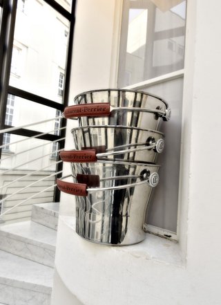 In der darunter liegenden Miniküche arbeiten sechs bis acht Beschäftigte auf wenigen Quadratmetern, um "Lachsschnittchen für 1400 Personen zu produzieren", wie Marc-Oliver Hendriks klagt, der Geschäftsführende Intendant der Staatstheater. Für die ausladenden Eiskübel ist hier gar kein Platz, sodass sie in einer Treppenhausnische ihr wackliges Dasein fristen.