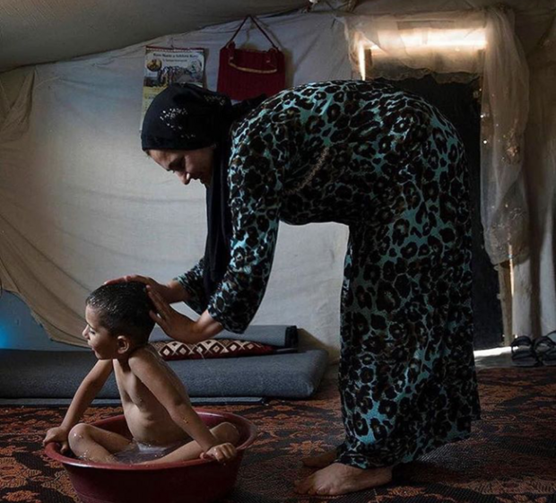 "Das war sozusagen das Bad in einem Familienzelt. Eine Schüssel und ein Behälter, mit dem man Wasser über sich gießen kann. Aber nicht immer gab es Wasser. Die Wasserleitung war sehr langsam. Deshalb musste man das Wasser zum Zelt tragen. Jedes Zelt hatte dafür einen Behälter. Wir haben viel Wasser gebraucht, da es so heiß war."