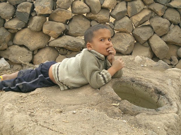 "Dies ist in Syrien im Dorf von meinem Vater. Wir haben Opa und Oma besucht. Der Junge heißt Selah Aldin. Er ist der Sohn von meinem Onkel. Sein Vater kämpft für die Kurden im Krieg und ist selten zu Hause. Der Junge liegt vor einem Lehmofen, wo Brot gebacken wird. Ich mag ihn. Er macht immer alles anders als andere Kinder – möchte wie ein Großer sein, stark! Damals wussten wir, dass wir aus Syrien weggehen wollten, aber noch nicht, wann. Im Dorf selbst gab es keinen Krieg. Aber es wurde immer schwerer, an Essen zu kommen, alles war teurer als früher."
