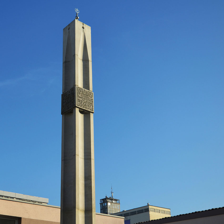 Das erste Stuttgarter Minarett, ein schlanker, quadratischer Turm aus Beton, aus dessen vier Seiten jeweils zeichenhaft die typische Minarettform herausgeschält ist, dient daher auch als Titelmotiv der Ausstellung. Der ursprünglich bosnischen Gemeinde im Industriegebiet Wangen war es wichtig, ein weithin erkennbares Zeichen zu setzen, damit Gläubige die Moschee überhaupt finden. Aber sobald eine Moschee an einem Minarett oder einer Kuppel auf den ersten Blick als solche erkennbar ist deutlich, warnen Rechtsnationale reflexhaft vor einer "Überfremdung des Abendlands".
