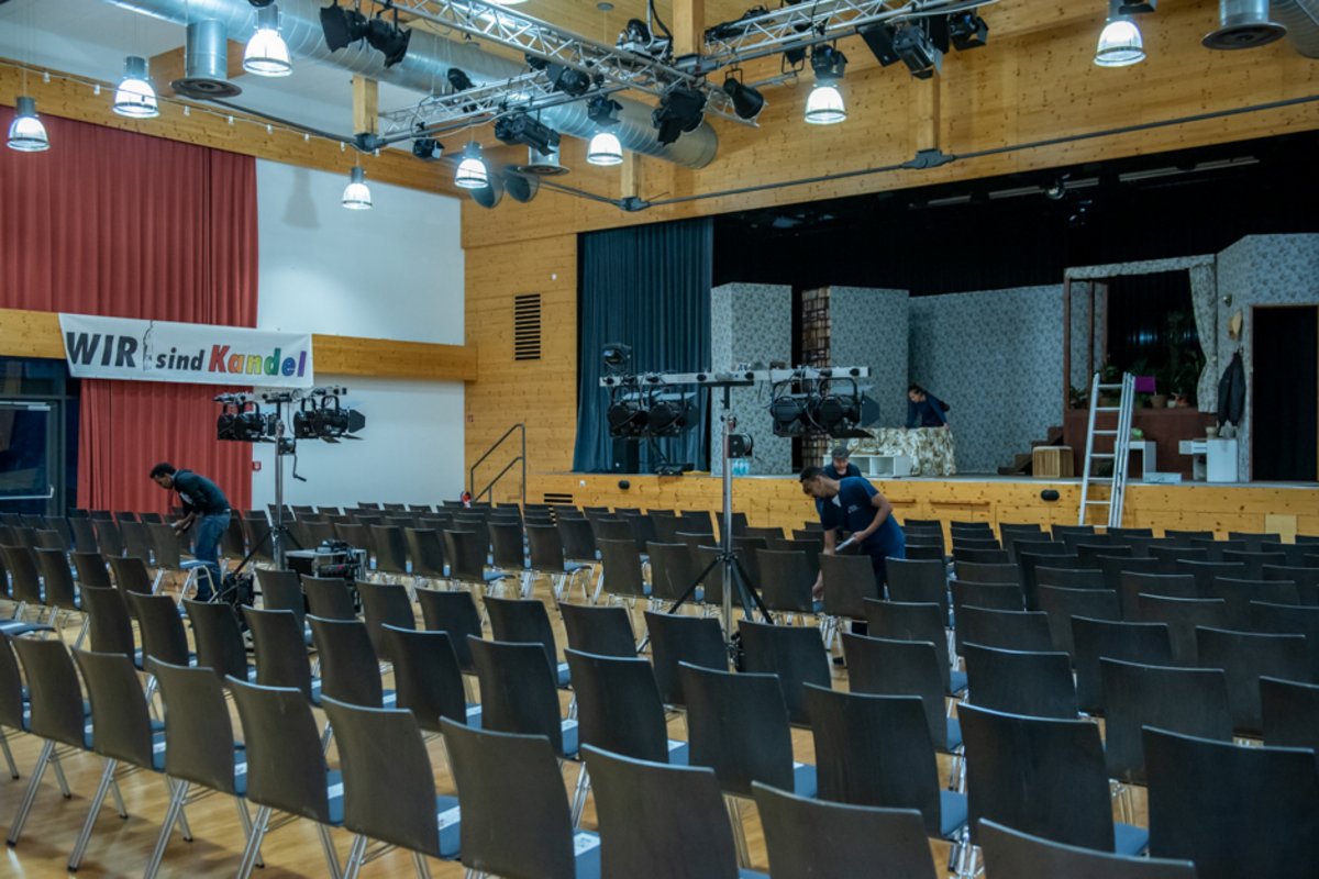 In der Bienwaldhalle baut das Bündnis "Wir sind Kandel" die Kulisse für ein Theaterstück auf. "Braun werden", heißt die Komödie. Es gibt einen Stand mit Infomaterialien, Ansteckern und Aufklebern, über einer Schale mit Trillerpfeifen klemmt ein Schild: "Wenn das rechte 'Frauenbündnis' vorbeikommt, pfeift drauf."