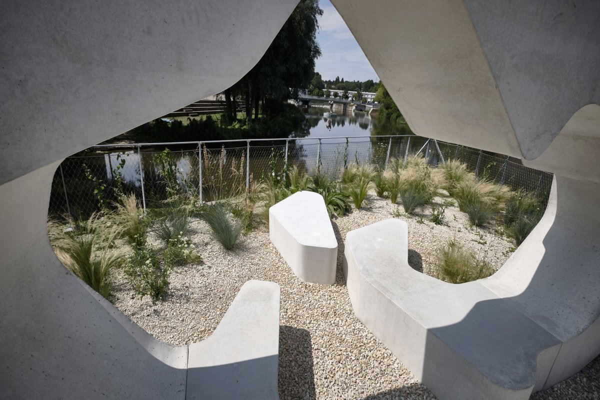 Mit knurrendem Magen davonfliegen wird Biene Remsi auch von Station 14 in Waiblingen, wo der Berliner Architekt Jürgen Mayer H. auf einer kleinen Flussinsel eine begehbare Gebäudeskulptur in einen Schottergarten einbettete. Nur vereinzelt sprießt neben dem "Haus im Fluss" etwas Grün. Was schon vor der Gartenschaueröffnung für politische Aufregung sorgte.