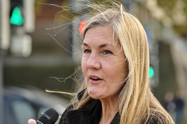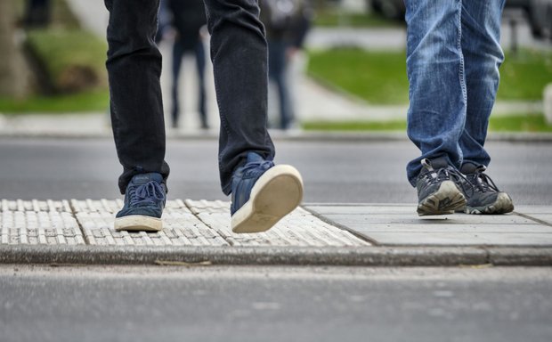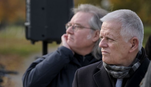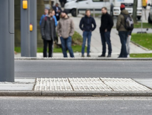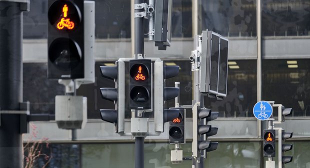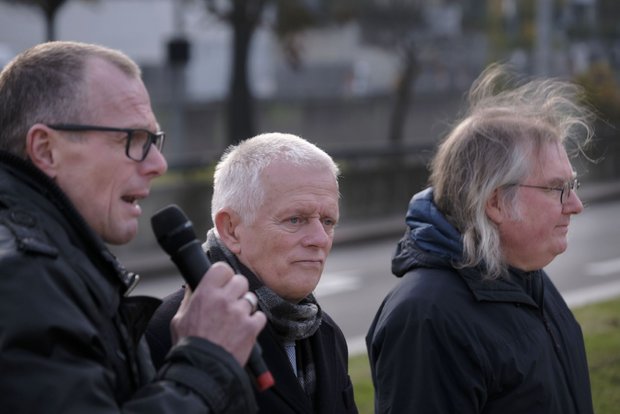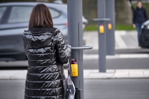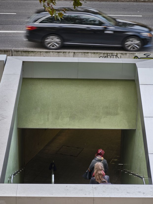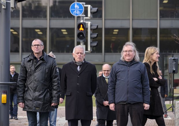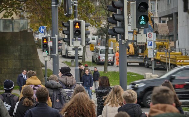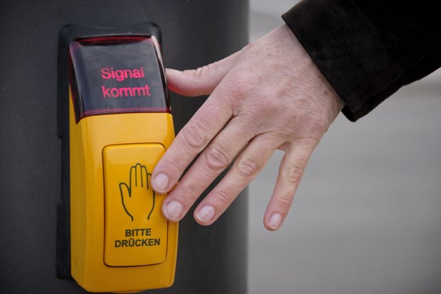Von Weitem sieht man bereits den kleinen Haufen Politiker und Presse und die beiden großen schwarzen Lautsprecher, die neben diesem Wunderwerk der modernen Ampeltechnik aufgestellt sind. Damit man bei all dem Autolärm an der B 14 auch hört, was der grüne Oberbürgermeister Fritz Kuhn zu dieser Feierlichkeit zu sagen hat. "... dass auch die Fußgänger hier zu ihrem Recht kommen", sagt er gerade, und dass da auf der anderen Straßenseite, "am anderen Ufer sozusagen, interessante Gebäude ..." ... WRRROOMMMM ... der Fahrtwind von 20 Tonnen LKW bei 60 Stundenkilometern wuschelt Veronika Kienzle, Bezirksvorsteherin Stuttgart-Mitte, durchs Haar.