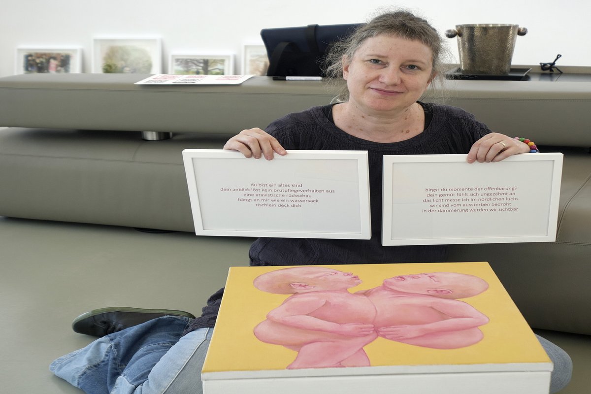Für Tiin Kurz, die vor ihrem Kunststudium bereits Germanistik und Kunstgeschichte studiert hat, ist Lyrik ein gleichberechtigter Teil ihrer Arbeit. Zu diesem Gemälde siamesischer Zwillingsbabys gehört eigentlich eine über Kopfhörer abhörbare Text- und Klangcollage, die aber wegen der Corona-Bestimmungen durch ausgedruckte Gedichte ersetzt wurde.