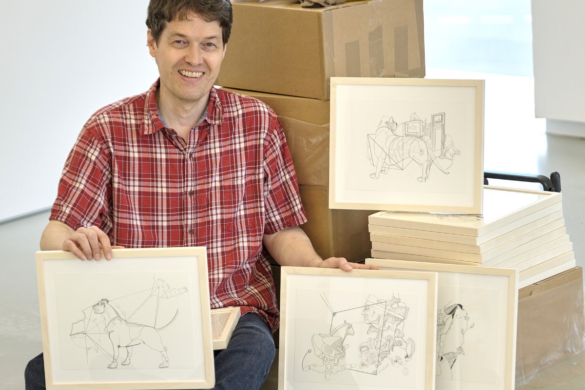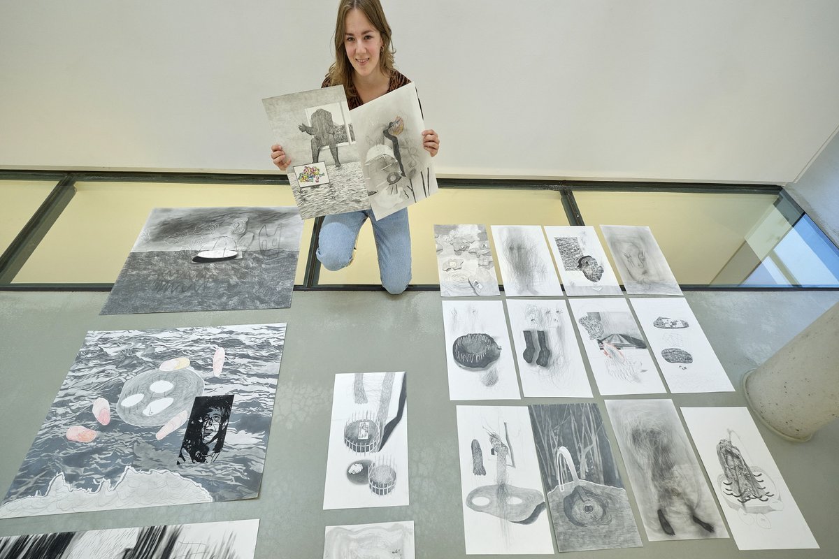 Stefanie Fleischhauer setzt in ihren surrealen Bleistiftzeichnungen dagegen Farbe sparsam ein, wie man im Bild unten sieht. Manche Betrachter fühlten sich an Traumgeschehen erinnert, aber auch von der russischen Herkunft ihrer Familie komme etwas zum Vorschein. Fleischhauer, die derzeit im sechsten Semester auf Lehramt studiert, genießt die Freiheiten des Kunststudiums gegenüber den verschulten Bachelor-Studiengängen der Universität.