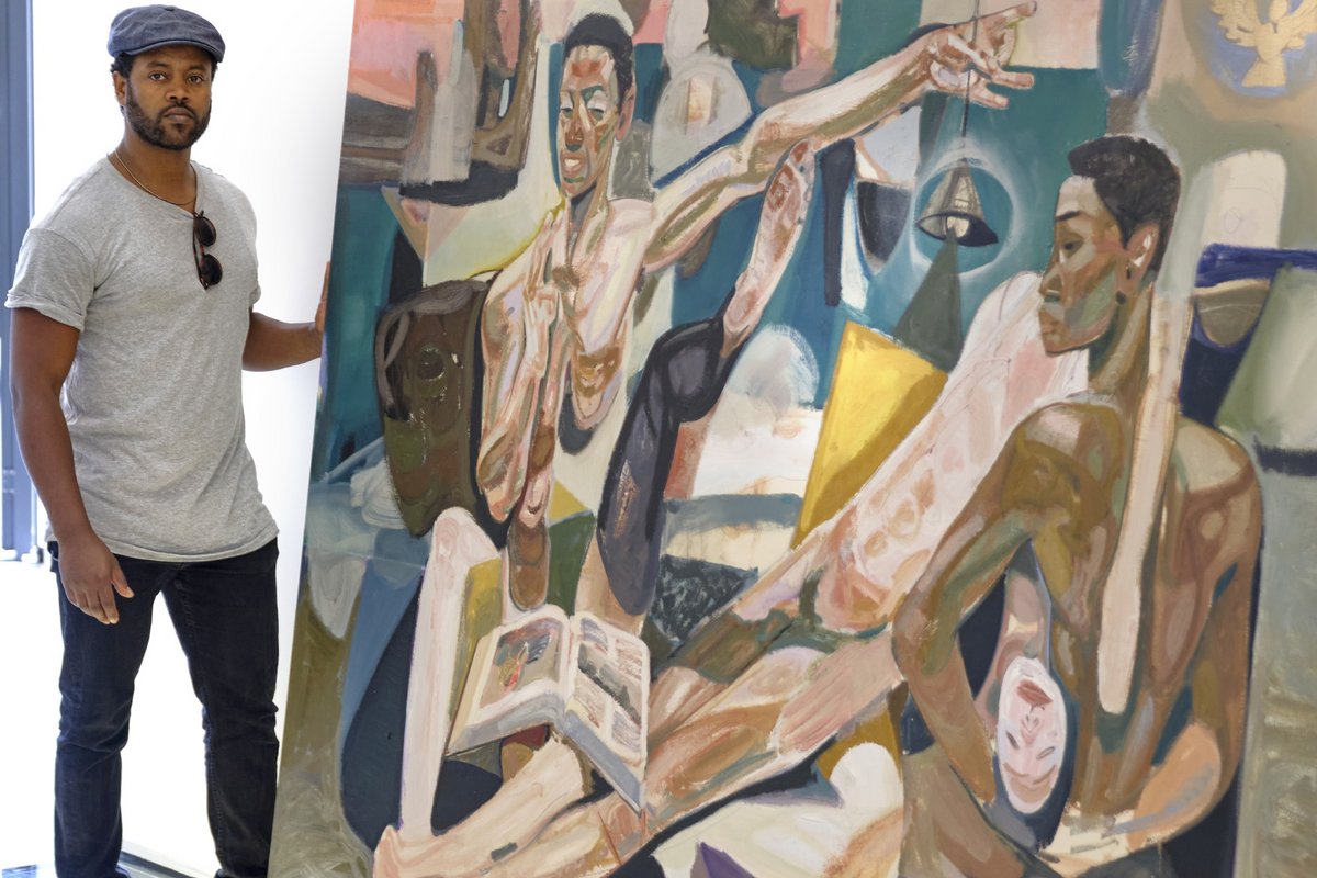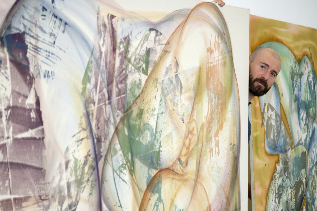 Ähnlich geht es Ivan Zozulya, der aus der Ukraine stammt. Dort ist auch das Kunststudium sehr stark verschult, wie er von Freunden weiß. 2012 ist er wegen des Studiums nach Stuttgart gekommen, 2017 hat er ein Deutschlandstipendium erhalten. Er arbeitet mit einer Mischung aus Siebdruck und Malerei, in der Gegenständliches wie Gesichter, Hände oder Füße erst hervortreten, wenn man die Formen und Farben in aller Ruhe einige Zeit auf sich wirken lässt.