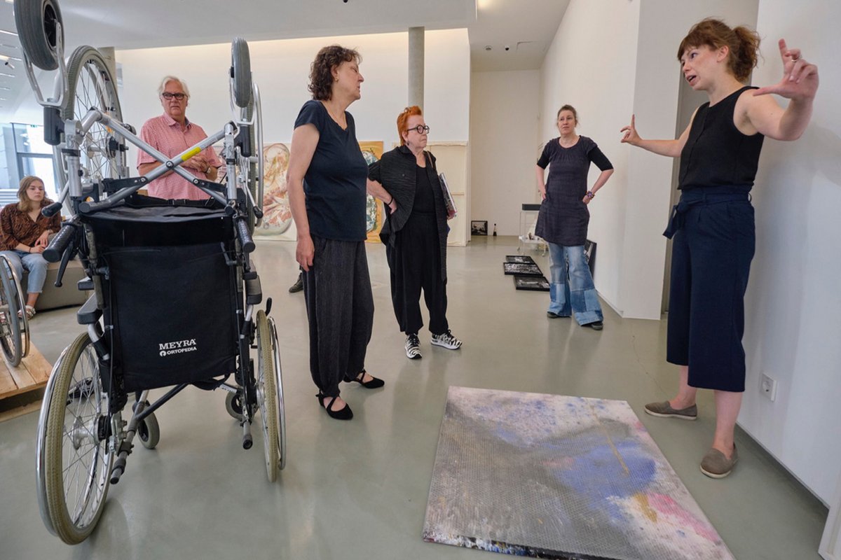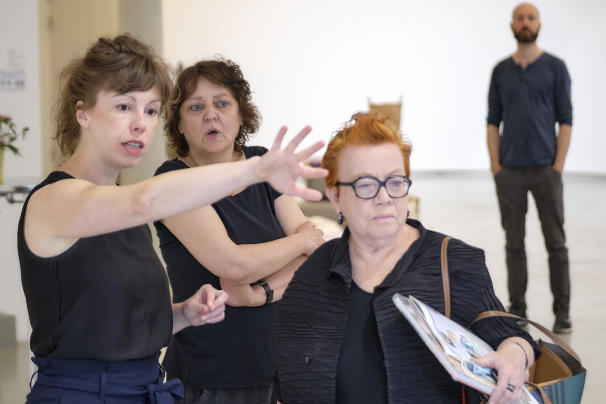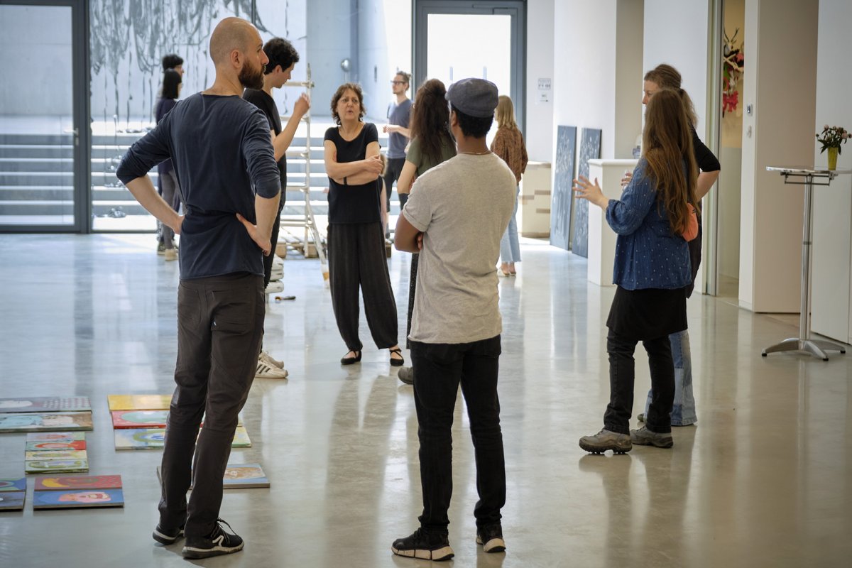 Argiro Mavromatis hat die Ausstellung kuratiert. Hier diskutiert sie beim Aufbau mit Güdemann und Karin Abt-Straubinger. Letztere hat die Galerie 2003 als dreigeschossigen Neubau an einer Straßenkreuzung in Stuttgart-Möhringen eröffnet. Die Werke in ihren Ausstellungen sind in aller Regel käuflich zu erwerben. Doch die Galerie AbtArt ist keine gewöhnliche kommerzielle Galerie. In erster Linie geht es der Galeristin darum, in ihrem Haus kuratierte Ausstellungen zu zeigen.