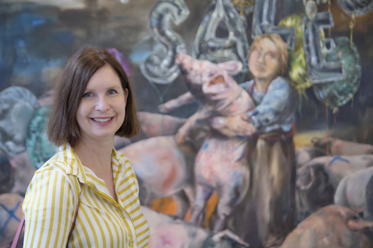 Karin Brosa hat Pharmazie studiert und als Apothekerin gearbeitet, bevor sie an die Stuttgarter Akademie kam. "Sale" lautet der Titel ihres Gemäldes, was sich über Billigfleisch-Skandale hinaus auch in einem weiteren Sinne ausdeuten lässt. Güdemann, die in den letzten Jahren unter anderem Seminare zu rechten Tendenzen und Menschenrechtsverletzungen in Deutschland angeboten hat, ermutigt ihre Studenten, zu politischen Themen Stellung zu beziehen.