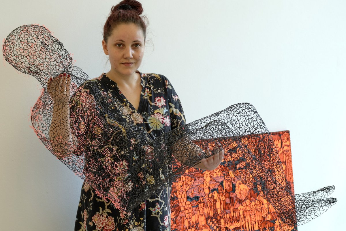 Dass der Schwerpunkt der Ausstellung auf Malerei liegt, kann bei einer Malklasse kaum verwundern. Alessia Schuth, die in diesem Jahr ihren Abschluss gemacht hat, zeichnet dagegen gewissermaßen im Raum. Sie benutzt einen 3D-Stift, aus dem flüssiger Thermoplast (um genau zu sein: Polylactid) austritt, der dann sofort erkaltet und hart wird.