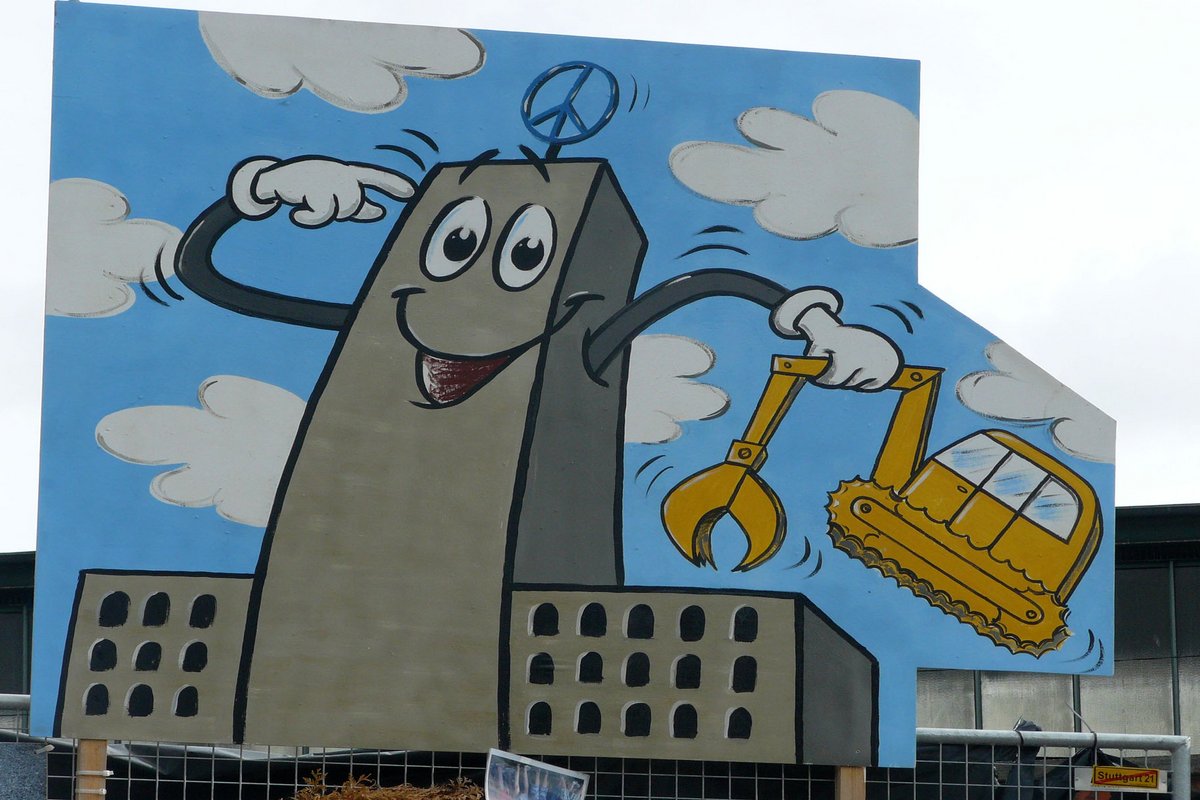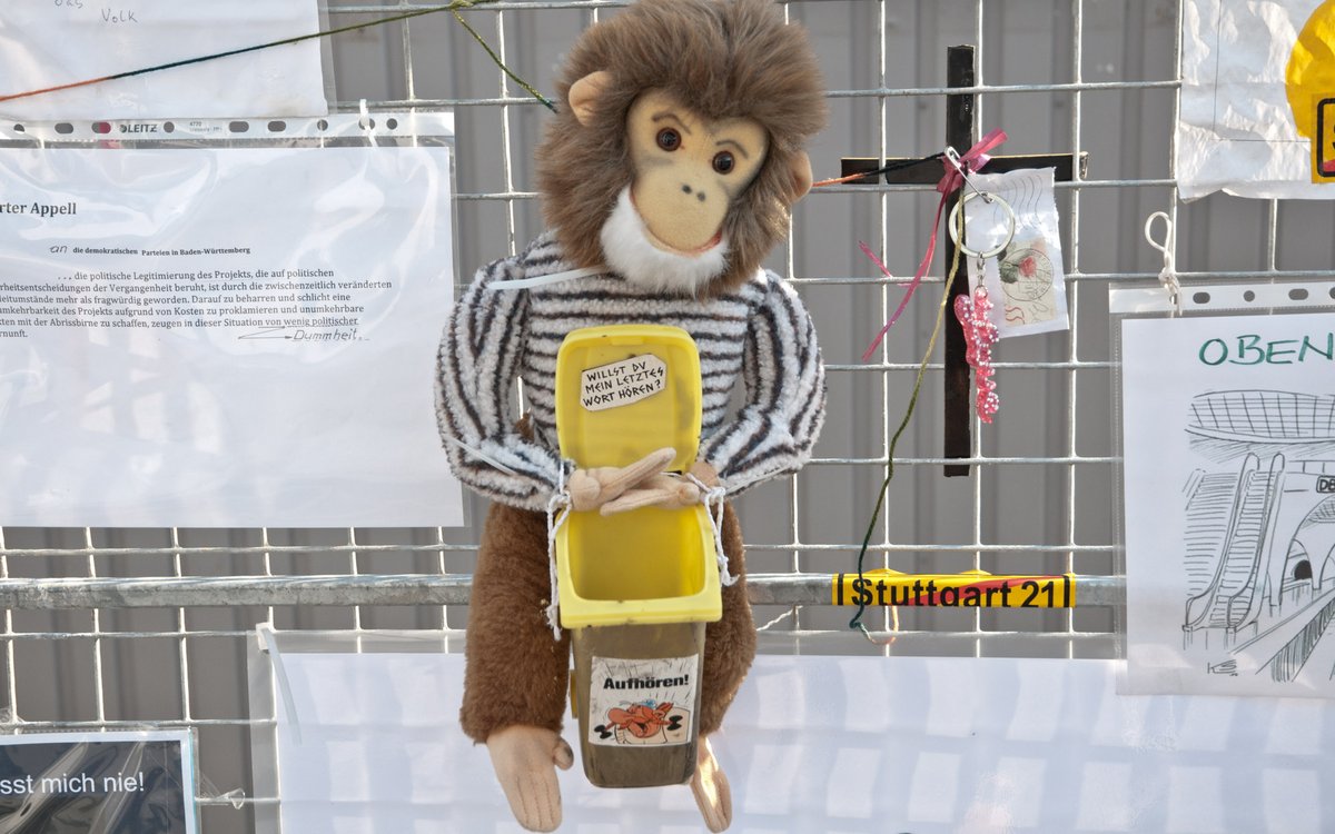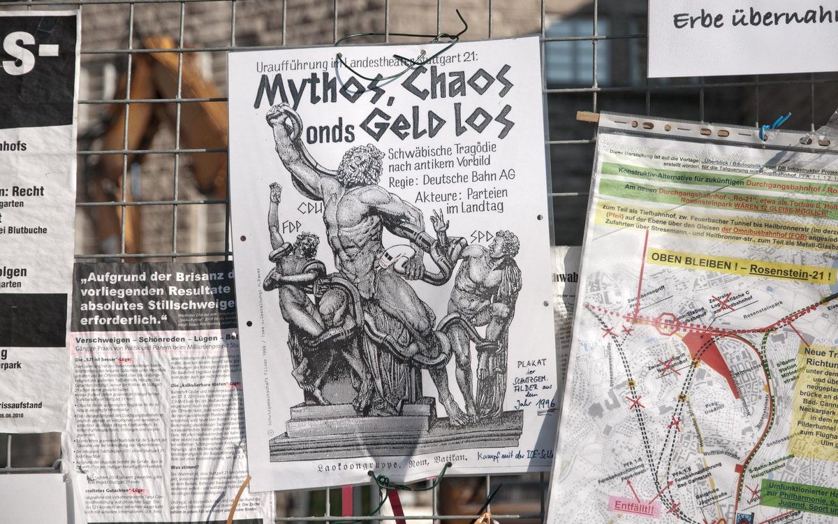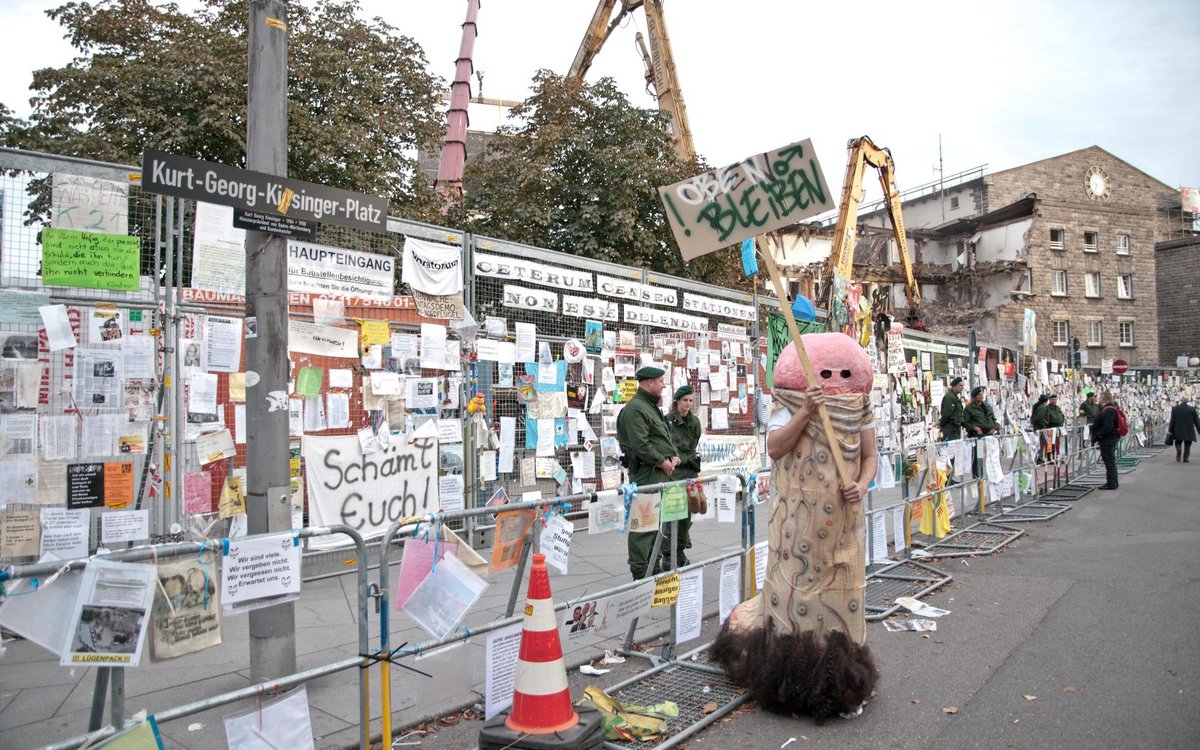 Ende Juli 2010 wurde unter Polizeischutz ein Absperrzaun vor dem Nordflügel des Bonatzbaus errichtet, der im Zuge von Stuttgart 21 abgerissen werden sollte. Stuttgarter BürgerInnen eigneten sich den Zaun schnell an und behängten ihn mit Collagen, Texten, selbstgebastelten Objekten. Unser Autor, ein Kunsthistoriker, bot damals Bauzaun-Führungen an.