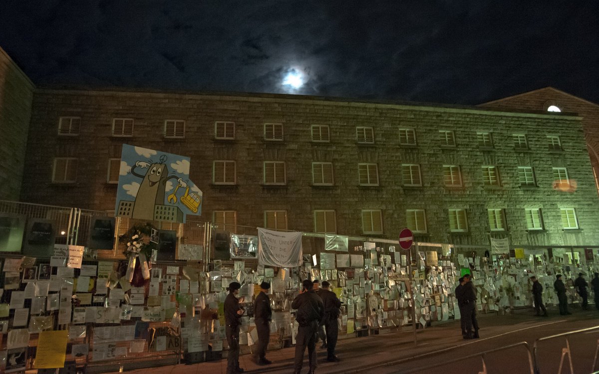 Inzwischen hatte sich der Bauzaun verändert. Um ihn zu erhöhen, war ein zweiter Zaun davorgestellt worden, so dass die ersten Beiträge nicht mehr geändert werden konnten. Stimmungen der ersten Tage wie ein Zettel mit der Aufschrift "Wir hoffen auf Angie" waren dort noch zu sehen. In dem sonst nicht zugänglichen Bereich zwischen den beiden Zäunen fanden dann unsere zwei Führungen mit je 20 Teilnehmern und einer in Zivil gekleideten Polizistin statt.