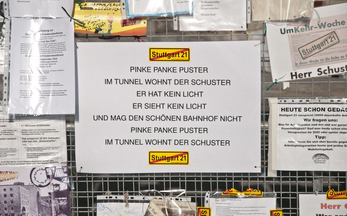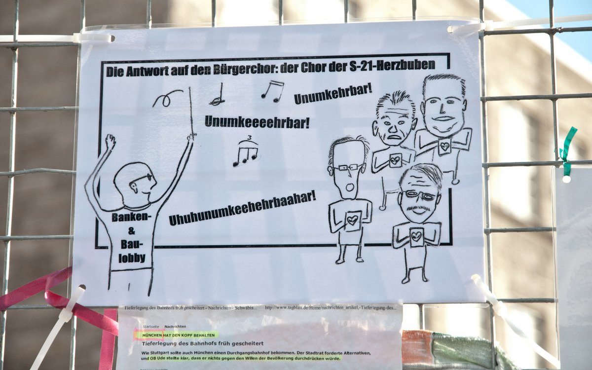 Die Anfänge des Bauzauns hatte ich nur über das Internet erlebt, denn ich war im Sommer mit meiner Frau in Alaska im Urlaub. Auf unserer Rückfahrt motivierte uns die Deutsche Bahn mit einer besonderen Aktion, uns dem Protest anzuschließen. Nach einem zwölfstündigen Flug, obendrein noch belastet durch eine zehnstündige Zeitverschiebung, fuhren wir mit dem ICE vom Frankfurter Flughafen zurück nach Stuttgart. Dann kurz vor Stuttgart blieb der Zug im Tunnel stecken. Erst nach drei Stunden kam ein Ersatzzug, nachdem mehrere Versuche gescheitert waren, den defekten ICE wieder in Fahrt zu bringen. Was würde den Bahnkunden erst erwarten, wenn Stuttgart auf rund 60 Kilometern im Rahmen von Stuttgart 21 untertunnelt wäre? Ich war jetzt sehr motiviert, mich aktiv in das Geschehen einzuschalten.