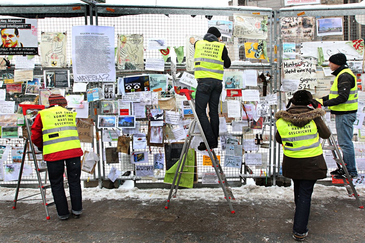 Unterstützung kam auch von unerwarteter Seite: Möglicherweise war es der einzige Erfolg der sogenannten Schlichtung, dass sich dort die Verkehrsministerin Tanja Gönner (CDU) in der fünften Sitzung dafür einsetzte, den Zaun im Haus der Geschichte zu zeigen. Am 2. Dezember war es dann soweit: Der Zaun wurde von Mitarbeitern des Hauses der Geschichte sorgfältig abgebaut. Diese trugen signalgelbe Westen mit der Aufschrift "Der Zaun kommt ins Haus der Geschichte", um klarzumachen, dass die Objekte jetzt nicht im Container landen, sondern im "Schutzraum Museum".
