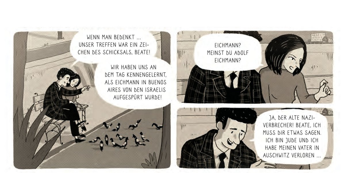 "Die Nazijäger" heißt der Band im Untertitel, denn das waren und sind die Klarsfelds nach der Kiesinger-Aktion die meiste Zeit gewesen: Sie begnügten sich nicht damit, alte Nazis und deren Verstrickungen öffentlich bekannt zu machen, sondern begannen, aktiv NS-Täter zu suchen, um sie vor Gericht zu bringen. Eine anstrengende und aufreibende Lebensaufgabe, aber für beide eine Art Mission, die sich auch aus ihren Lebensgeschichten und ihrer unterschiedlichen Herkunft ergibt, wie der Comic verdeutlicht: Nachdem Beate und Serge Klarsfeld sich 1960 in Paris kennen gelernt und verliebt haben – sie ist dort als deutsches Au-Pair-Mädchen –, erzählt ihr Serge bei einem ihrer ersten Treffen von der Geschichte seiner jüdischen Familie. Und dass sein Vater 1943 von der SS in Nizza verhaftet, nach Auschwitz deportiert und dort ermordet wurde. Beate ist geschockt, auch weil die NS-Geschichte in ihrer Familie – und auch in Deutschland insgesamt – nur sehr wenig thematisiert wurde.
