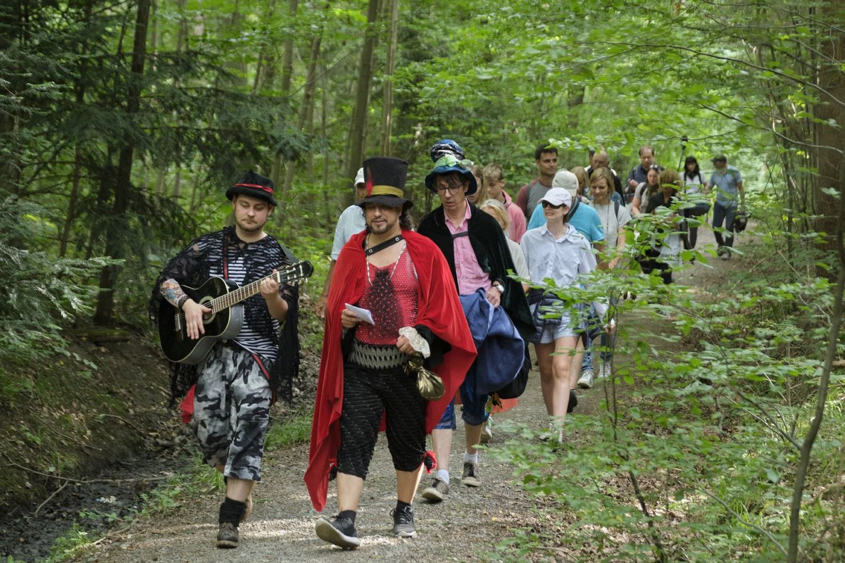 An einen Baum gelehnt schlägt Stefan Vitelariu ein paar Akkorde in seine Gitarre. Er spielt "All Along the Watchtower" – eine Anspielung auf den nahe gelegenen Fernsehturm? Im Song von Bob Dylan unterhalten sich ein Spaßvogel und ein Dieb, eine Wildkatze knurrt und der Wind beginnt zu heulen. Bald werden auch die Teilnehmer am Parcours des Theater am Olgaeck aufheulen: Wenn sie nämlich erfahren, dass sich Räuber in vergangenen Zeiten durch Tierstimmen verständigten. Wolfsgeheul stand für Gefahr.