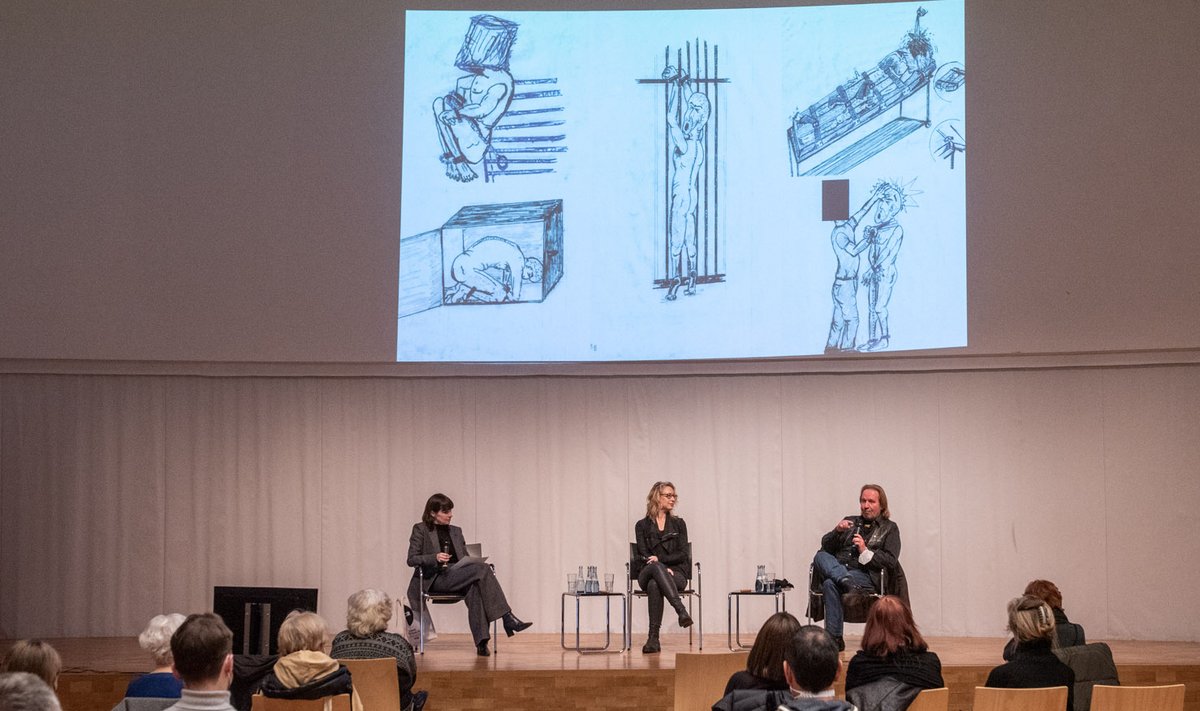 Podiumsdiskussion im Stadthaus Ulm. Im Hintergrund: Zeichnungen des Guantánamo-Gefangenen Abu Subaidas. Foto: Jens Volle