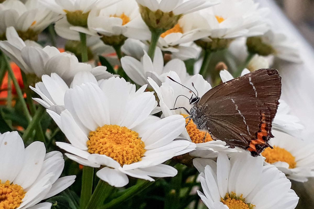 Im Frühling sieht es hier noch geordnet und übersichtlich aus. Die ersten Wildbienenwinzlinge – Mauerbienen (vorne schwarz, hinten rostrot) – finden den Weg in mein Balkonien, nuckeln an Krokussen und Armenischen Hyazinthen, die ich übergangsweise gepflanzt habe und die schon bald verblüht sein werden. Die Sommergewächse müssen ja erst noch sprießen und gedeihen. Es ist noch recht ruhig in meinem Reich, schließlich muss es sich ja erst herumsprechen, dass es dort etwas zu holen gibt. Und in den dritten Stock hochzufliegen, muss sich schon lohnen. Vollstes Verständnis, liebe Nektar- und Pollenkonsument:innen. Dann aber, Summsalabrumm, ab dem späten Mai und dann von Woche zu Woche immer mehr, geht es richtig ab. Kaum mehr zwei Klappstühle finden im Juli noch Platz im Gewucher aus Mädchenaugen, Topfzucchini oder Leinkraut, das sich hier übrigens von selbst ausgesät hat. Es muss vor ein paar Jahren mit dem Wind gekommen sein.