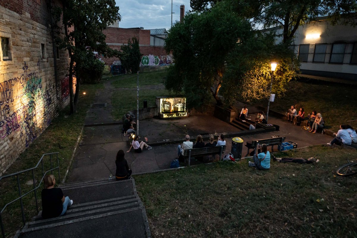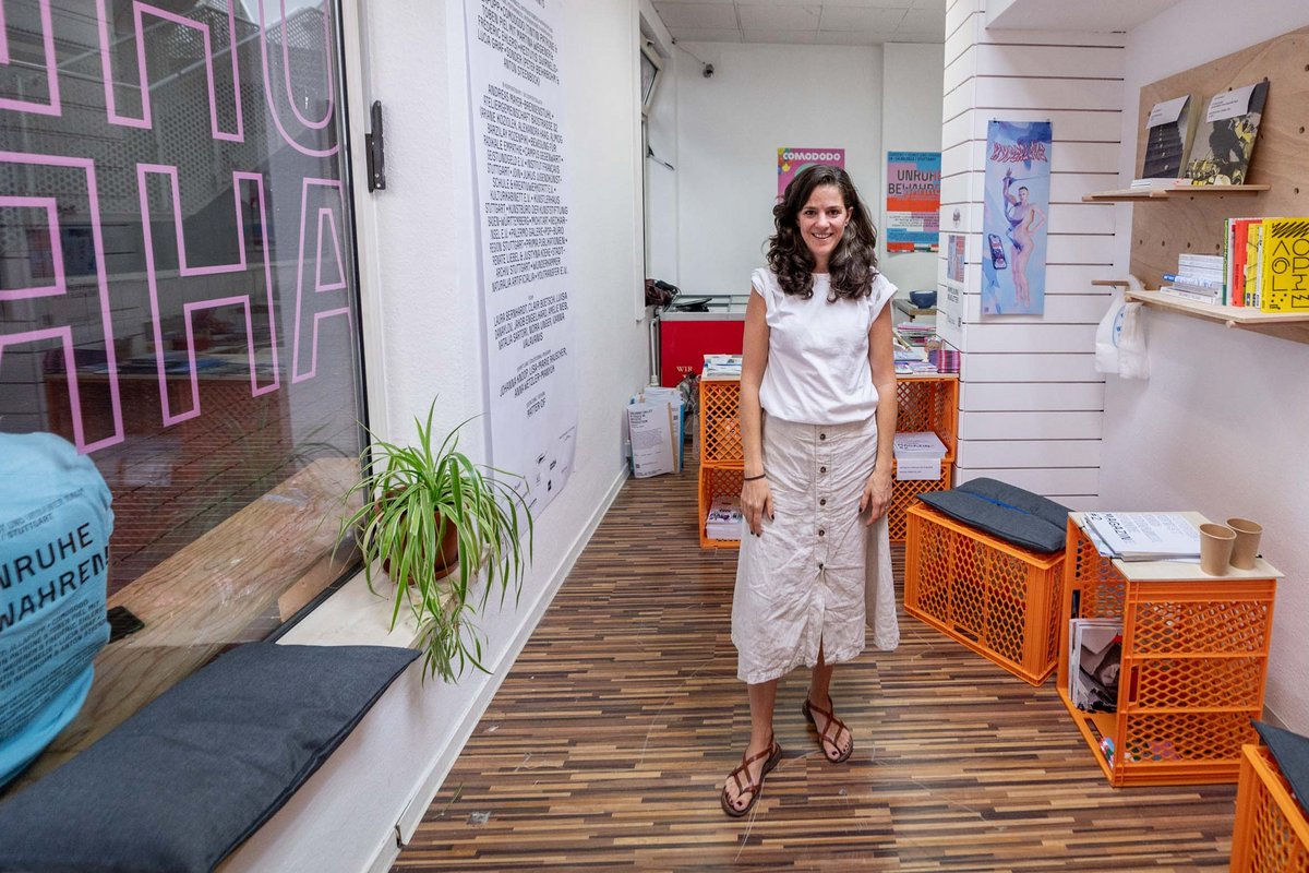 Und gleich kehrt buntes Leben ein. Kinder haben das Straßenpflaster durch Schablonen mit Kreide besprüht: eine Aktion der Jugendkunstschule (JuKuS). Ein T-Shirt-Druckworkshop hat stattgefunden. Passant:innen kommen herein und fragen nach dem einen oder anderen Programmpunkt. Natalia Sartori und ihr Assistent:innen helfen gern und haben viel zu tun.