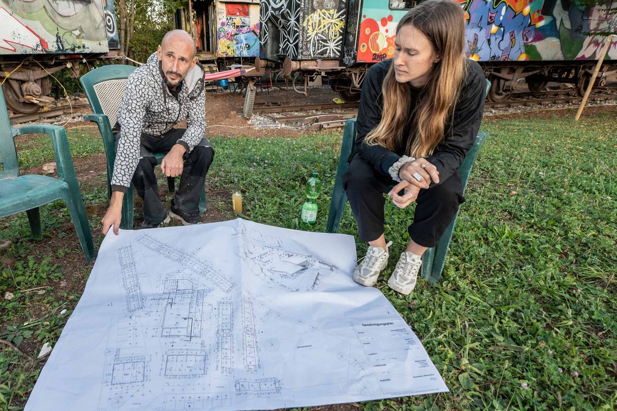 Dass es so gut funktioniert hat, liegt daran, dass alles so gut vorbereitet war. Und an den fünfzehn freiwilligen Helfer:innen, die sich auf den Aufruf von Lena Engelfried und Benjamin Köhl vor Ort, über Newsletter und in den sozialen Medien gemeldet haben. Von den Künstler:innen der Waggons waren nur zehn dabei. Einige sind auf Tournee, erklärt Köhl, der sich lieber als Balu anreden lässt. Schließlich müssten alle die Miete für ihre Waggons erwirtschaften. Eben deshalb kümmern sich Engelfried als Projektleiterin und er nun hauptamtlich um den Umzug und den neuen Standort, bei dem noch mehr zu tun ist, als die Waggons zu versetzen. 1,5 Stellen finanziert die Stadt Stuttgart dafür in diesem Jahr.