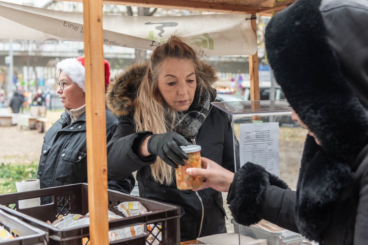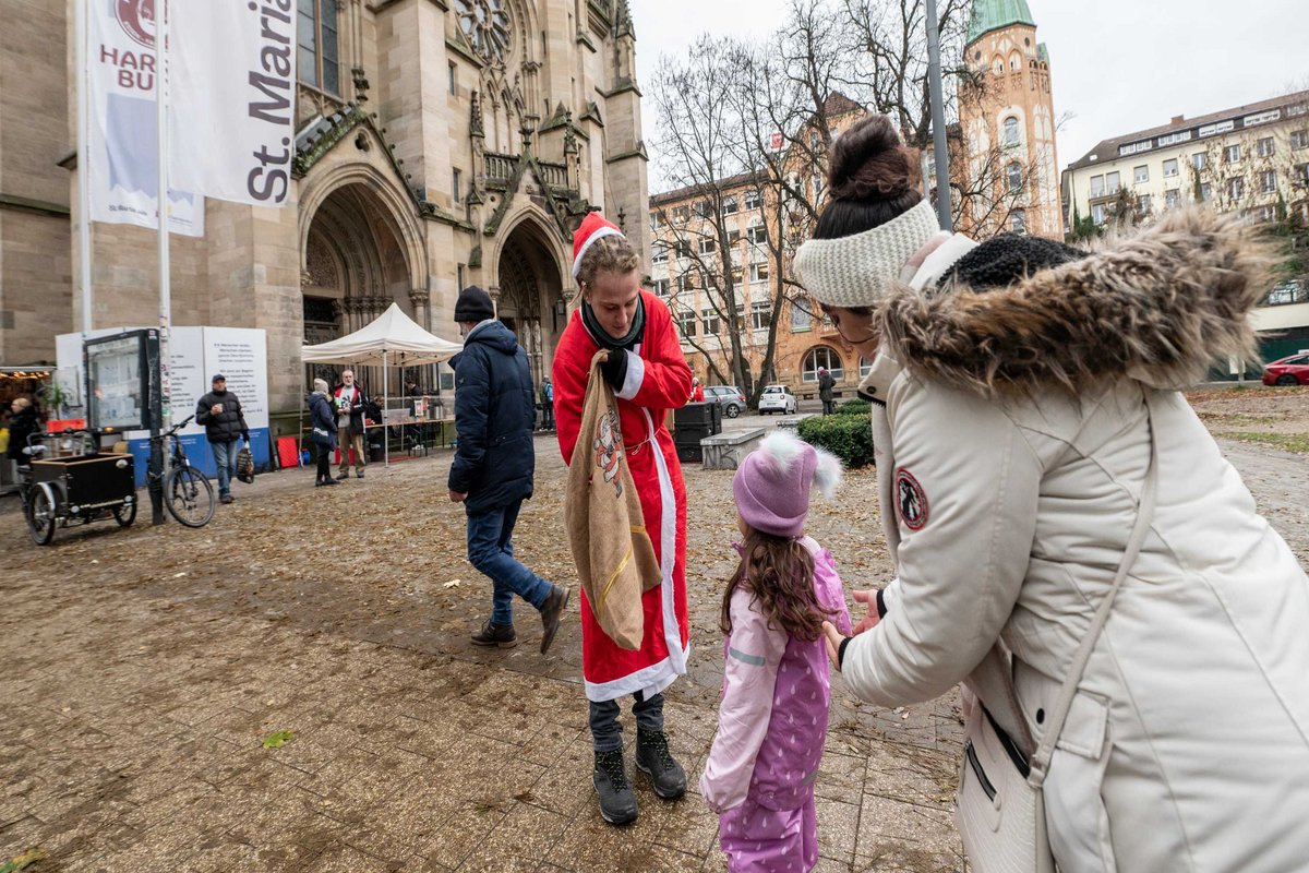 Es ist der 6. Dezember, der Nikolaustag. Petra Bleile fährt mit ihrem VW-Bus zur Kirche St. Maria im Paulinenviertel beim Österreichischen Platz. Jeden Samstag baut sie dort ihren Verschenkflohmarkt auf, nicht weit von Harrys Bude. Harry Pfau verschenkt an diesem Marktstand im Schatten der Kirche gerettete Lebensmittel an Menschen, die sie zu schätzen wissen. Der Nikolaustag ist auch bei Harrys Bude etwas Besonderes: Zum Salat, der gut ist, aber weggeworfen werden sollte, gibt es Schokolade. Und Bleiles Bus ist vollgepackt mit Spielwaren, die bald in Kinderhände gehen sollen. Dieser Nikolaus kommt allerdings erst vier Tage später bei der Weihnachtsfeier, die der Verein Helfende Hände im Mehrgenerationenhaus Heslach organisiert.