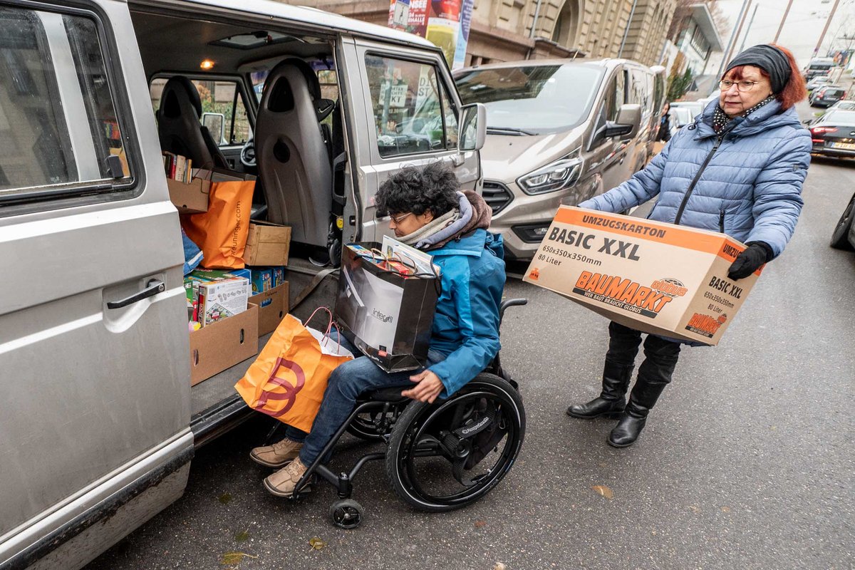 Bleiles Helferinnen am Nikolaustag sind Elisabeth Schäffner-Singer und Nanette Peithmann. Schäffner-Singer kommt aus Neugereut und arbeitete zuerst mit bei Kathys Vesper, einem Angebot der altkatholischen Gemeinde in der Katharinenkirche, das in den Wintermonaten jedoch ruht; Peithmann lebt in Zuffenhausen und gründete die Initiative #aktioneinkaufswagen. "Wir verbinden Helfer mit Leuten, die sie unterstützen möchten", erklärt sie. So kommt es, dass die Helfenden Hände, der Förderverein, der Petra Bleiles Verschenkflohmarkt trägt, nun auch Spielwaren, haltbare Lebensmittel und Hygieneartikel von Annas Lädle, einem Unverpacktladen in Plieningen, erhalten: "Anna Florek, die Besitzerin, hat ihren Kunden die Möglichkeit gegeben, diese Sachen zu spenden."