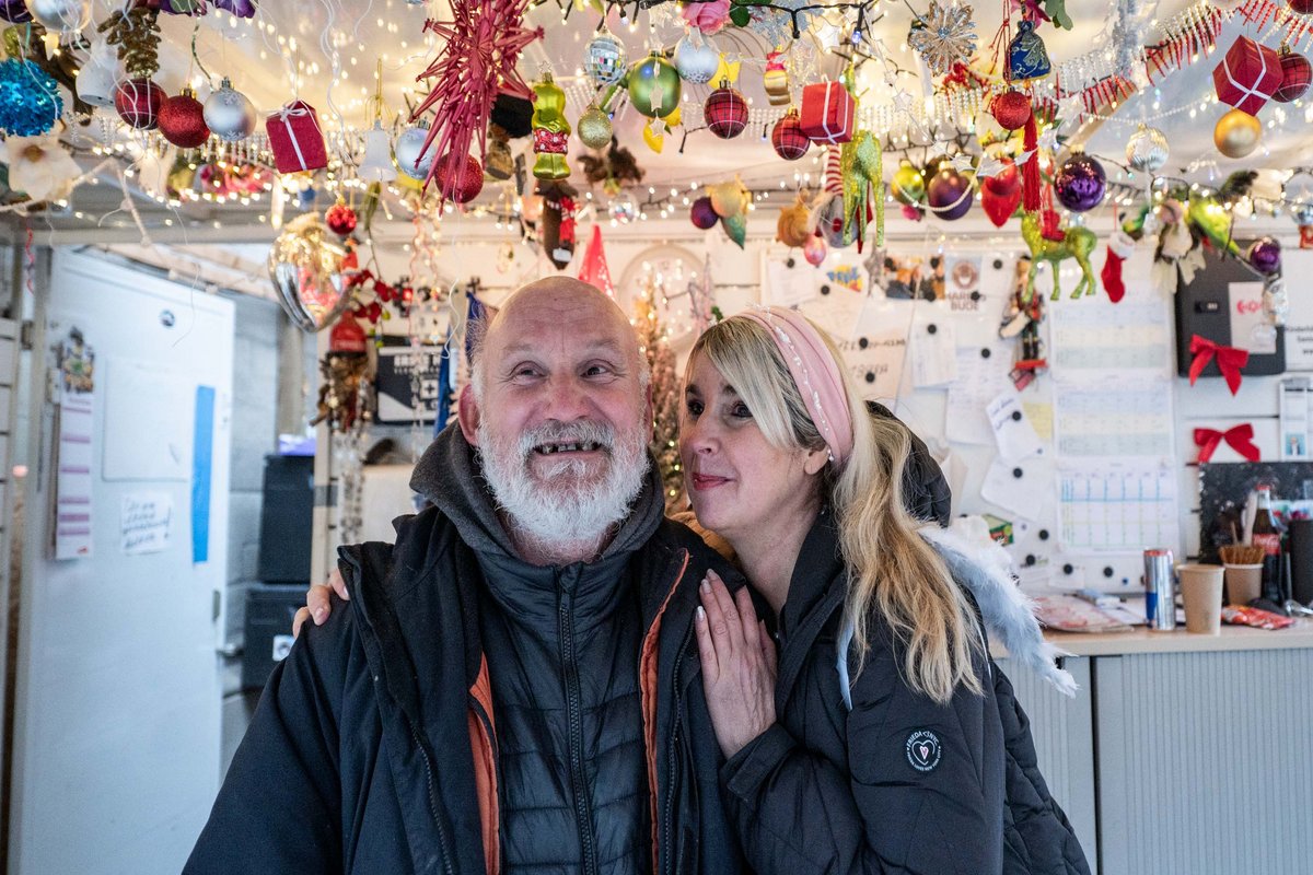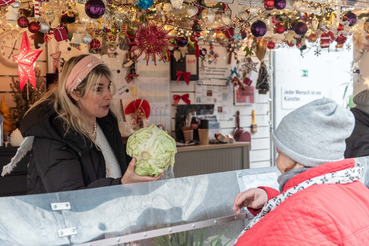 Sophia ist eine von ihnen, und am Nikolaustag ist sie ein Engel. Sie trägt ein weißes Kleid und über ihr, unter der Decke des Marktwagens, glänzen Sterne, Lametta, elektrische Lichter. "Ich bin hier vorbeispaziert vor acht oder neun Wochen", erzählt sie. "Ich dachte, das sei ein Imbisswagen, aber dann habe ich festgestellt, dass man hier nichts kaufen kann. Ich habe Harry gefragt, was er macht und er hat es mir erklärt. Ich habe mir spontan ein T-Shirt übergezogen und mitgeholfen."