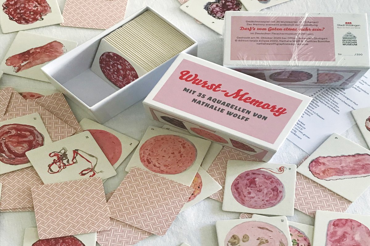 2018 kam Nathalie Wolff auf ein neues Thema: "¼ Pfund Aufschnitt" ist das erste Buch betitelt, in dem ihre Wurst-Aquarelle versammelt sind. Daraufhin lud sie Christian Baudisch vom Deutschen Fleischermuseum in Böblingen ein, dort 100 Wurstaquarelle auszustellen, begleitet von einer opulenten Publikation, die den schwäbischen Metzgerspruch ins Hochdeutsche übersetzt: "Darf’s vom Guten etwas mehr sein?" In dem Buch fördert Matthias Bumiller auf der Grundlage seiner Recherchen im Archiv des Fleischermuseums viel Interessantes und Wissenswertes zutage. So etwa über ein Lexikon der Kuhnamen des Bayrischen Rinderzüchterverbands oder die Geschichte von Lenins Metzger Pius Ruff aus Jungingen. Ergänzend produzierte das Fleischermuseum aus Wolffs Aquarellen ein Wurst-Memory, das bald vergriffen war, woraufhin sich glücklicherweise ein Großmetzger fand, der sich bereit zeigte, eine zweite Auflage zu finanzieren.
