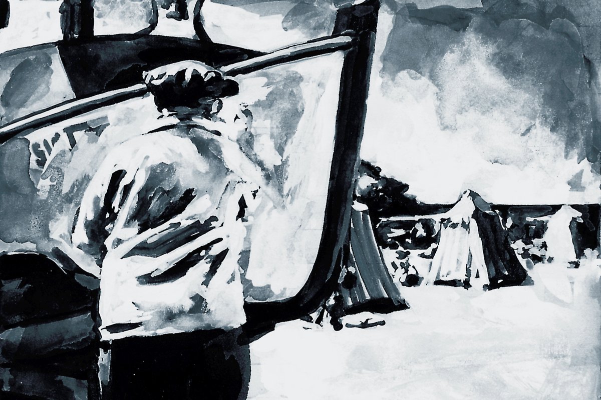 Sie erzählte ihm, dass sie Standbilder aus Jacques Tatis "Die Ferien des Monsieur Hulot" aquarelliere, in Schwarz-Weiß wie der Film. Sie beschlossen, sich im Hotel De La Plage in Saint-Marc-sur-Mer am Atlantik einzuquartieren, wo Tati den Film gedreht hat. Und aus ihren Aquarellen ein Buch zu machen, das dann zur Sonnenfinsternis erschien – mit Ringbindung und Spinnenpapier zwischen den Blättern wie bei einem Fotoalbum. Beigefügt war eine CD mit dem Soundtrack des Strands: Wellen, Kinder, Möwengeschrei, Rufe von Eisverkäufern. Dabei hatten sie nur ihren neuen Minidisc-Rekorder testen wollen.