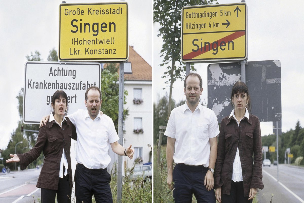 Die Bilder in "Unsere Ferien", 2012 erschienen, sprechen eigentlich für sich. Genauer gesagt sprechen die Ortseingangsschilder, vor denen Bumiller und Wolff sich abgelichtet haben, von dem, was sie vor der Kamera mimen. Zur Vorderseite gehört immer auch eine Rückseite mit durchgestrichenem Ortsnamen. Hier tun die beiden genau das nicht, was auf dem Schild steht und was sie vor der Vorderseite darstellen.