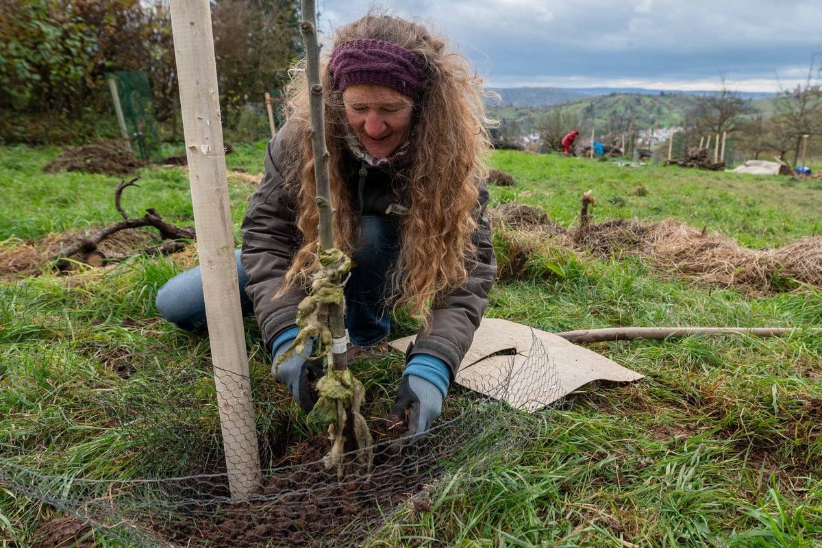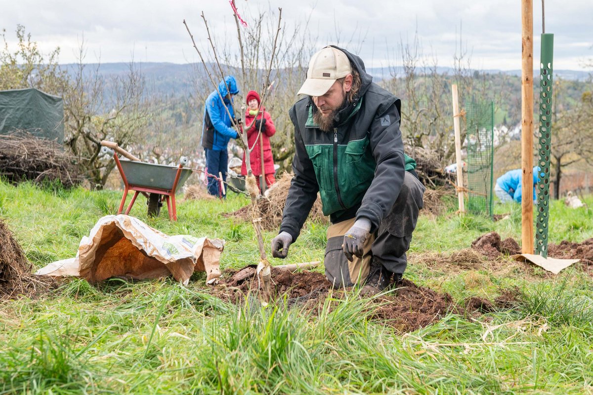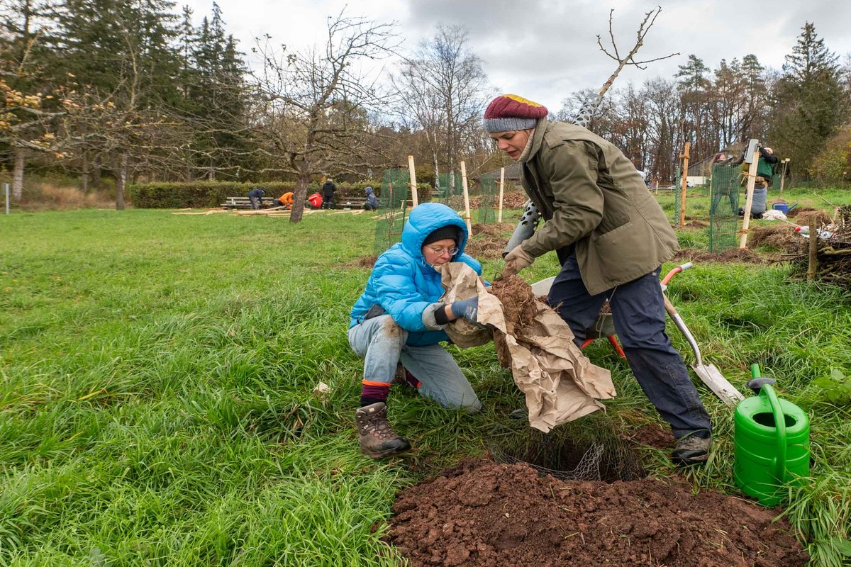 Hammerschläge mischen sich in das Geräusch einer Säge, ein rauer Wind weht. Sonne, Wolken und leichtes Schneegestöber wechseln sich ab. Auf der Wiese nahe der Waldwirtschaft "Sieben Linden" im Stuttgarter Stadtteil Uhlbach herrscht geschäftiges Treiben: Pflanzlöcher werden gebohrt, einige Personen pflanzen Bäume, andere sägen und montieren Rankgerüste. Ein Torbogen wird vorbereitet. Eine kleine Gruppe um Valentin Claus, Permakulturexperte und beim "Stadtacker Wagenhallen" angestellt, diskutiert über die Befestigung der Jungbäume, dessen zarte Wurzeln bei heftigem Wind gefährdet sind. Thomas Puls vom Bioladen "Plattsalat West", der heute für die Küche verantwortlich ist, beobachtet das aktive Treiben der Teilnehmenden, schenkt Heißgetränke aus und ist begeistert von der guten Organisation.
