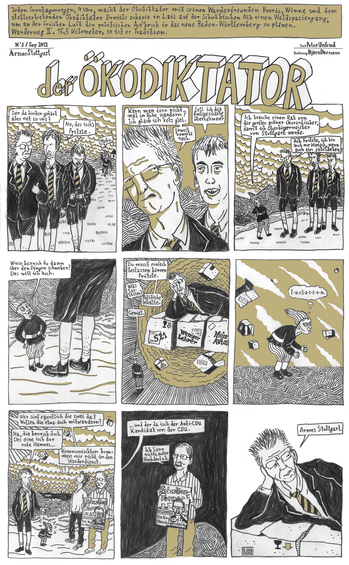 Jeden Sonntagmorgen, 9 Uhr, macht der Ökodiktator mit seinen Wanderfreunden Booris, Winne und dem stellvertretenden Ökodiktator Drniils zu Hause in Laiz auf der Schwäbischen Alb einen Waldspaziergang, um an der frischen Luft den politischen Aufbruch in das neue Baden-Württemberg zu planen. Manchmal kommt die Ökodiktatorin auch mit.