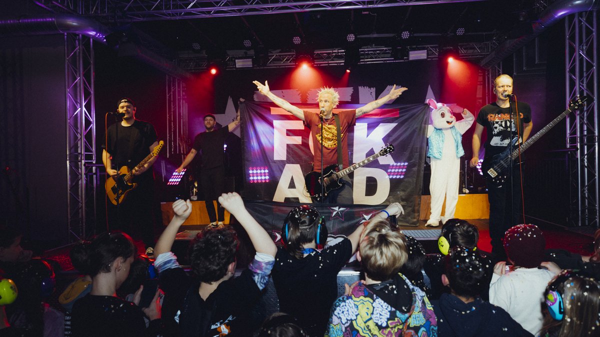 Vor der Bühne in Stuttgart hat die Punkband eine Fläche für die Kinder abgesperrt. Die meisten tragen einen Gehörschutz, manche ein pinkes Bändchen. Eltern haben ihre Handynummer auf das Bändchen geschrieben. Falls ihr Kind im Getümmel verloren geht. Väter und Mütter stehen neben und hinter der Absperrung, viele mit einem Kind an der Hand oder auf der Schulter.
