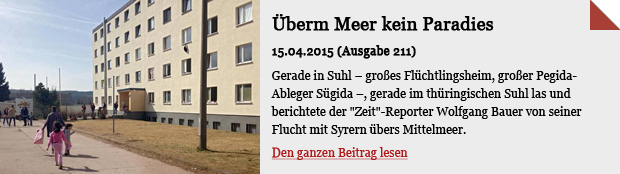Wenn Adelino Mussavira anfängt zu erzählen, ist er nicht mehr zu stoppen. Soviel ist passiert, seit der "Zeit"-Journalist Wolfgang Bauer im vergangenen März hier im Thüringischen Suhl aus seinem Buch gelesen, in der hiesigen Volkshochschule von seiner Recherche als Flüchtling übers Meer berichtet hat. Und Mussavira, den alle nur Adelino nennen, der ehemalige DDR-Vertragsarbeiter aus Mozambique, der Diakon, der in der Erstaufnahmestelle Suhl Flüchtlinge betreut und im März mit Wolfgang Bauer diskutiert hat – er weiß nicht, wo anfangen. Der Streit im Flüchtlingsheim hat auch seine Arbeit geprägt.