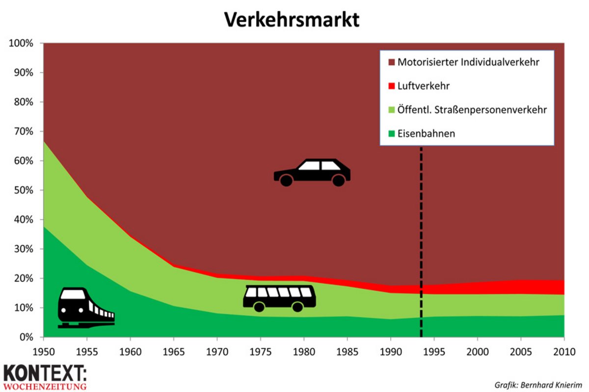 Das erklärte Ziel "höherer Anteil im Verkehrsmarkt" wurde nicht erreicht. Da der Verkehrsmarkt insgesamt wuchs, blieb der Anteil der Schiene trotz eines Wachstums der Fahrgastzahlen und der Leistung (Personenkilometer) nahezu konstant (6,6 Prozent 1994 und 7,5 Prozent 2012). Dass es anders geht, zeigt ausgerechnet der Binnenflugverkehr. Dessen Anteil erhöhte sich im gleichen Zeitraum von drei auf fünf Prozent.