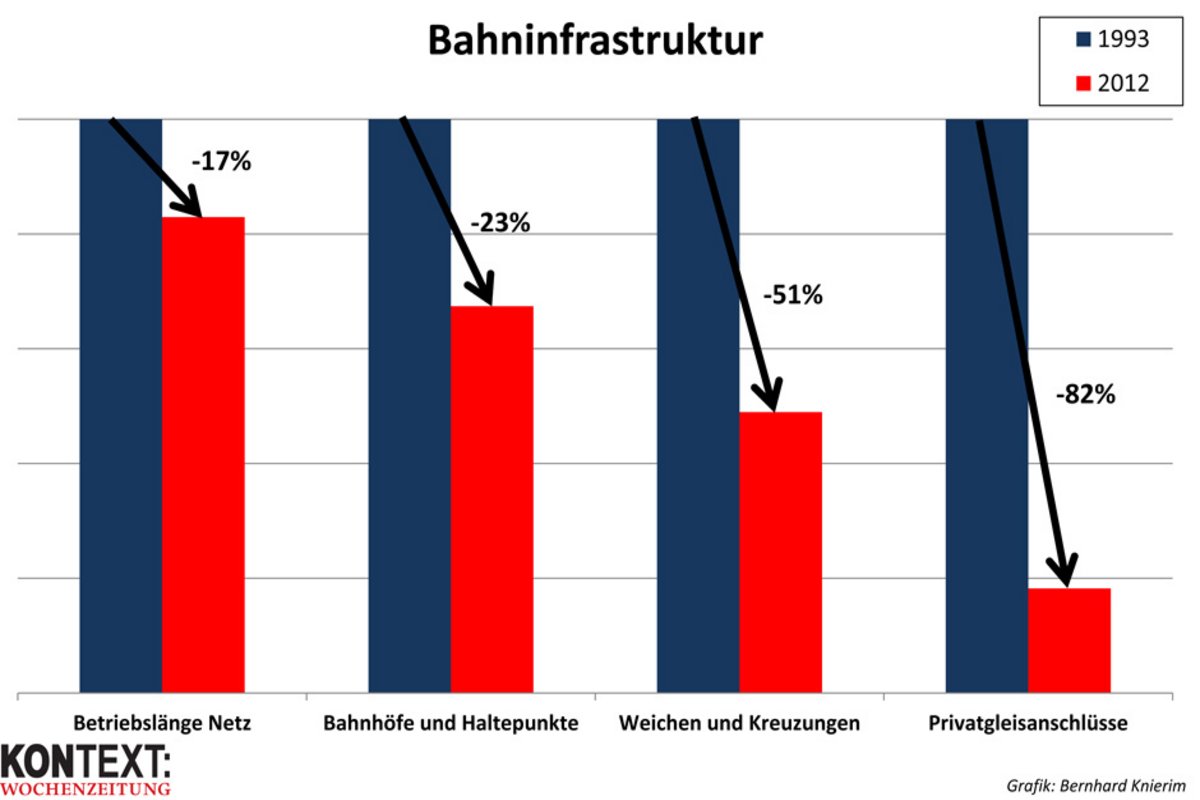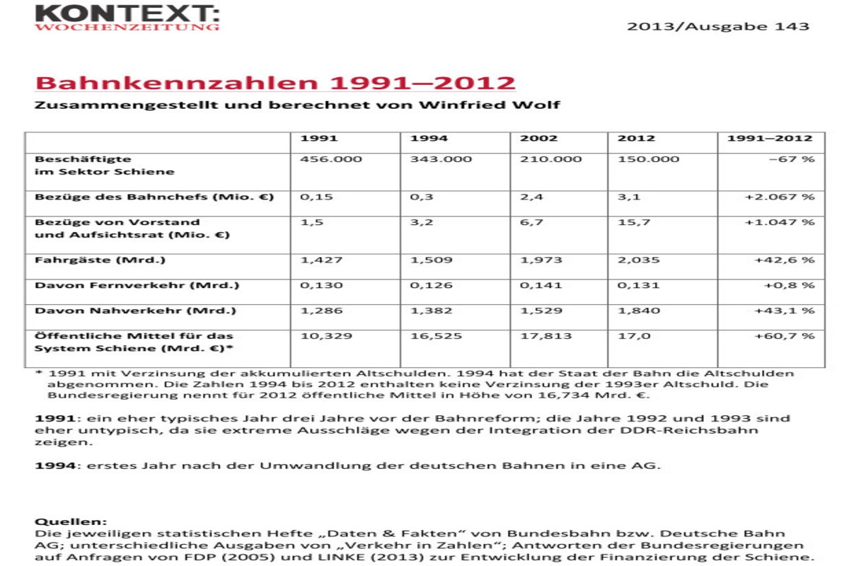 Das zweite Ziel, die Reduktion von Staatsknete im Schienenverkehrssektor, wurde grandios verfehlt. Die staatlichen Gelder, die pro Jahr in den Schienenverkehrssektor fließen, haben sich gegenüber der Zeit vor der Bahnreform (und abzüglich der Sonderaufwendungen für die DDR-Reichsbahn) deutlich erhöht – von (umgerechnet) gut zehn auf rund 17 Milliarden Euro pro Jahr. Es handelt es sich dabei um folgende Positionen: gut vier Milliarden Euro für Erhalt und Ausbau der Infrastruktur, 7,1 Milliarden für die Länder, die damit den Regionalverkehr bezahlen, dazu 5,2 Milliarden für Bundesbahn-Altlasten, Pensionen sowie für die noch rund 40 000 Bahnbeamte, deren Gehalt der Bund teilweise bezahlt. Dazu kommen 0,6 Milliarden Euro an sonstigen öffentlichen Geldern. Sie werden unter anderem von Länder und Kommunen für Bahnhofsinstandhaltung- und -renovierung aufgebracht. Eine detaillierte Aufschlüsselung enthält die Antwort der Bundesregierung auf die Kleine Anfrage der Linken vom 12. 11. 2013; DS 18/00016.