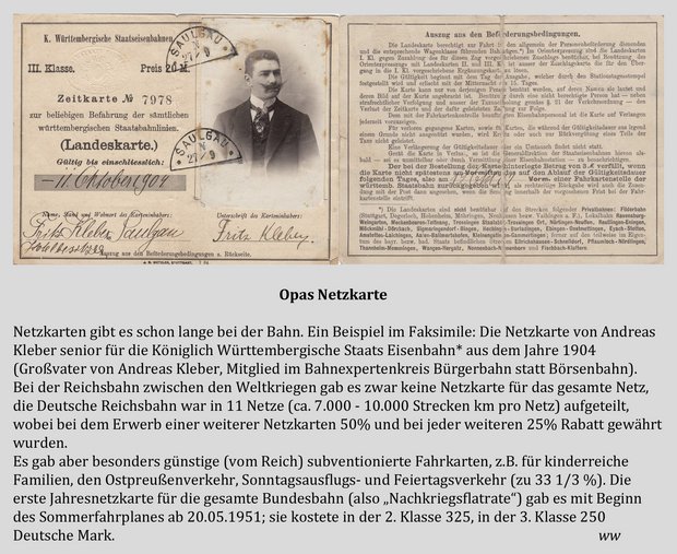 Gut und schön. Der Hintergedanke bei dem Geschenk könnte ein Blick in meine persönliche Daten gewesen sein: Ich muss in diesen Wochen das Geld für die neue BahnCard 100 zusammenkratzen. Und: Es ist die dreißigste. Seit 1986 habe ich eine BahnCard 100, damals hieß es noch "persönliche Netzkarte". Seit 1986 kaufe ich keine Fahrkarten, wenn ich im deutschen Netz mit der Bahn fahre. Einfach einsteigen und los. Im Jahr mindestens 250 einzelne Fahrten. Oder 10 000 Fahrten seit 1986. Und in den letzten zwei Jahrzehnten – wohl auch weil die Bundesrepublik Deutschland größer wurde – immer deutlich mehr als 35 000 Schienenkilometer im Jahr. 2014: 39 000 km. Gut, da lasse ich mal die Multiplikation mit 30 weg. Das riecht dann allzu sehr nach Tonnenideologie. Oder nach "'s Kärtle abfahre".
