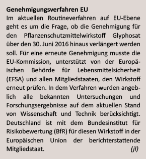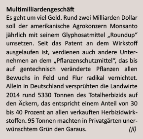 Vergangene Woche gab es schlechte Nachrichten für die Agrarindustrie: Die EU-Mitgliedsstaaten konnten sich nicht einigen, ob Glyphosat in Europa weiter auf Acker und Gartenbeet Tabula rasa machen darf. Zu groß waren Bedenken, dass das Herbizid mehr schadet als nutzt. Zwar hatten die europäische Behörde für Lebensmittelsicherheit (EFSA) und das deutsche Bundesinstitut für Risikobewertung (BfR) das Spritzmittel bei sachgemäßem Gebrauch als gesundheitlich unbedenklich eingestuft. Die Internationale Agentur für Krebsforschung (IARC) der Weltgesundheitsorganisation (WHO) ist allerdings anderer Meinung. Deren Experten bewerten den in den Siebzigerjahren vom US-Konzern Monsanto entwickelten Pflanzenvernichter als erbgutschädigend und "wahrscheinlich krebserregend".