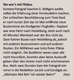 Nun gibt es diese Mär vom David-gegen-Goliath-Kampf – Bus gegen Bahn. Doch mit der Anfang August erfolgten Übernahme von Postbus durch Flixbus erreicht das fusionierte Unternehmen Flixbus gut 80 Prozent des gesamten Fernbusgeschäfts. Der einzige relevante Konkurrent, die Deutsche Bahn AG, die noch rund 14 Prozent Fernbus-Marktanteile hält, kündigte an, demnächst aus dem Markt auszusteigen. Bei Flixbus, so heißt es, handle es sich trotz hohem Marktanteil um ein eher kleines Unternehmen; das Bundeskartellamt habe schließlich eine Überprüfung der Flixbus-Postbus-Fusion unter anderem mit der Begründung abgelehnt, der Gesamtumsatz des neuen Unternehmens liege "unter der Schwelle von 500 Millionen Euro Jahresumsatz".